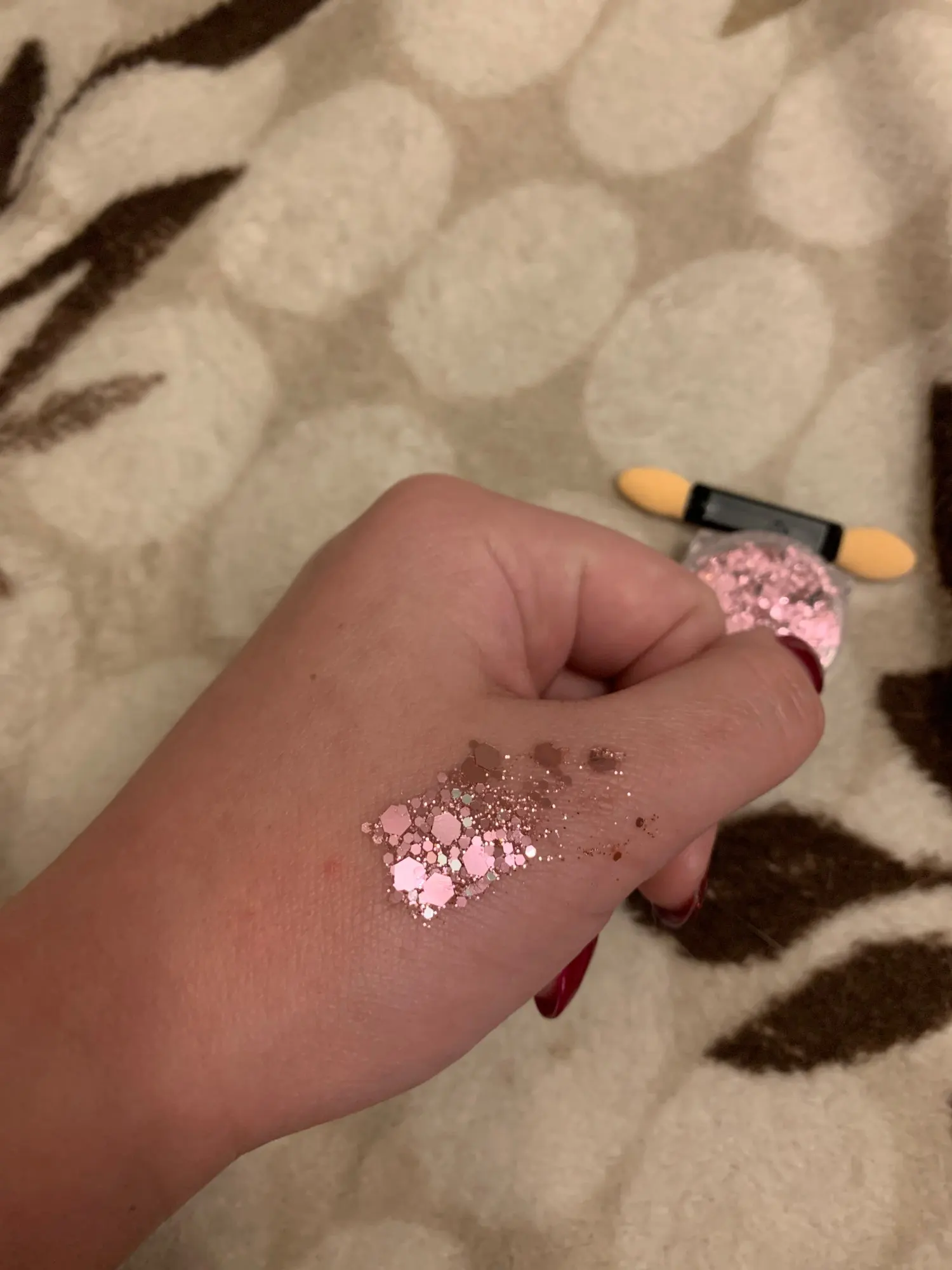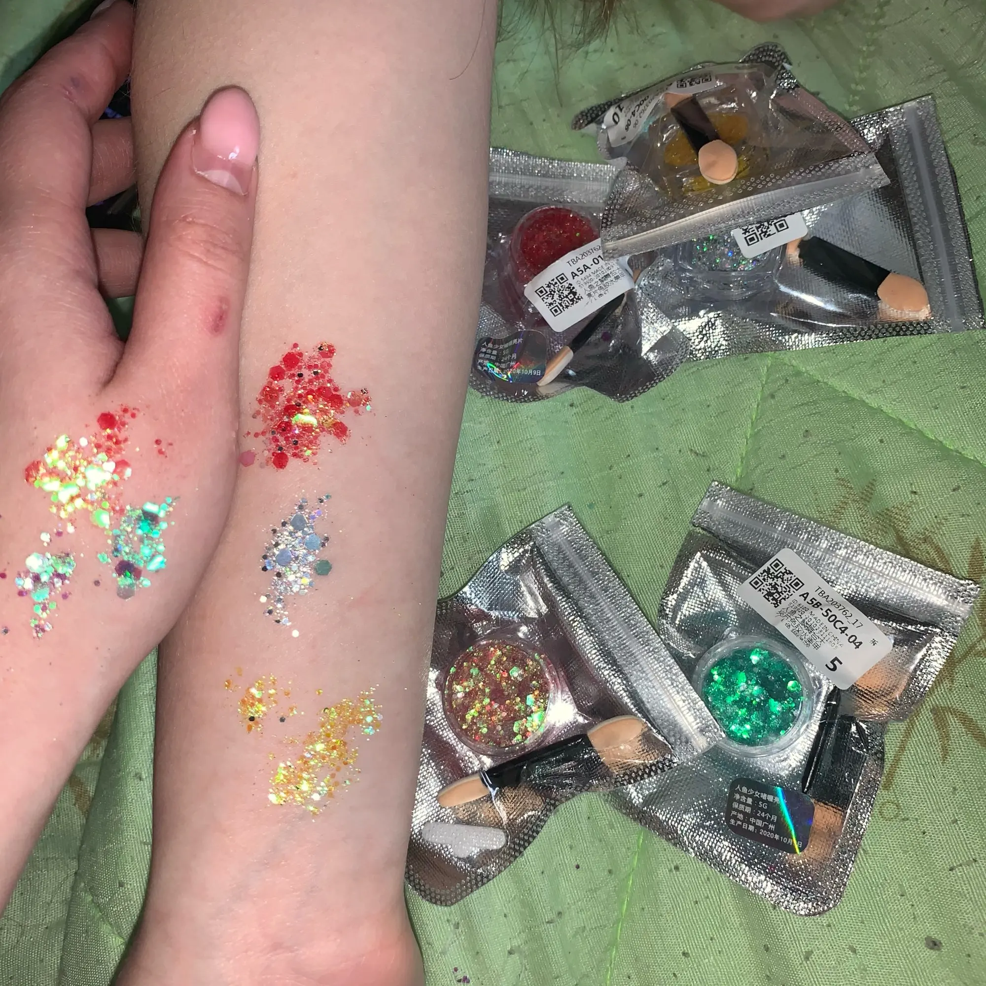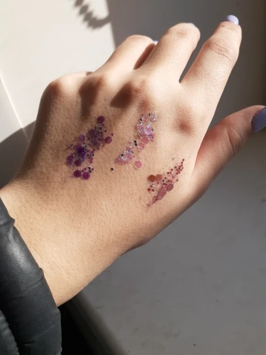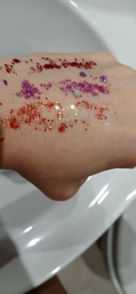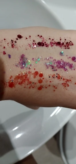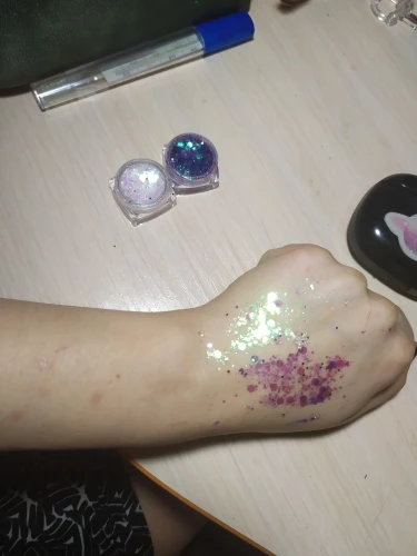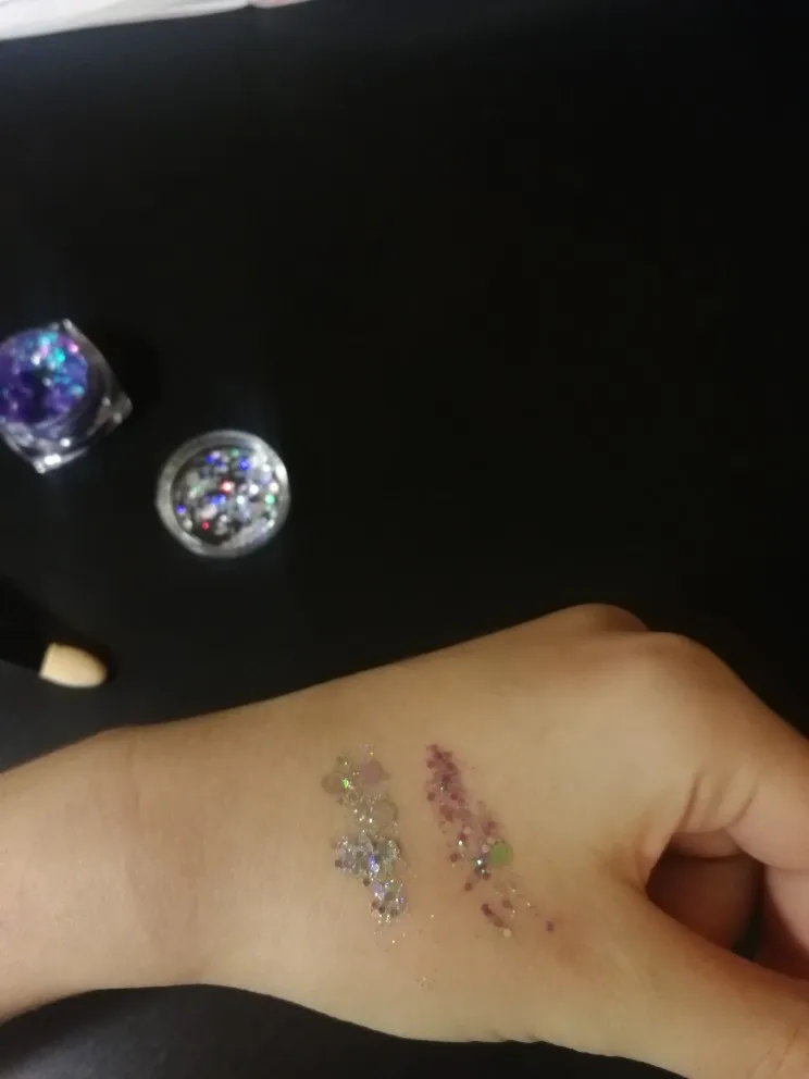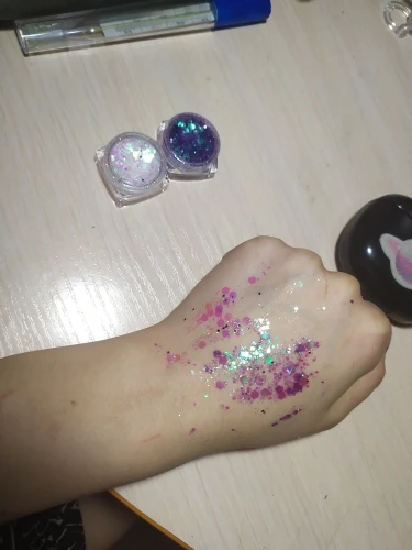 блестки как на фото. наносятся хорошо, но они быстро засыхают (сложно подправить) и могут отваливаться. доставка в спб ровно 2 месяца. товар не отслеживался. даже почта россии не смогла понять что это за трэк номер (вместо 4 букв в нем было 5). в общем, для просмотра 2 сезона эйфории товар подойдет :)