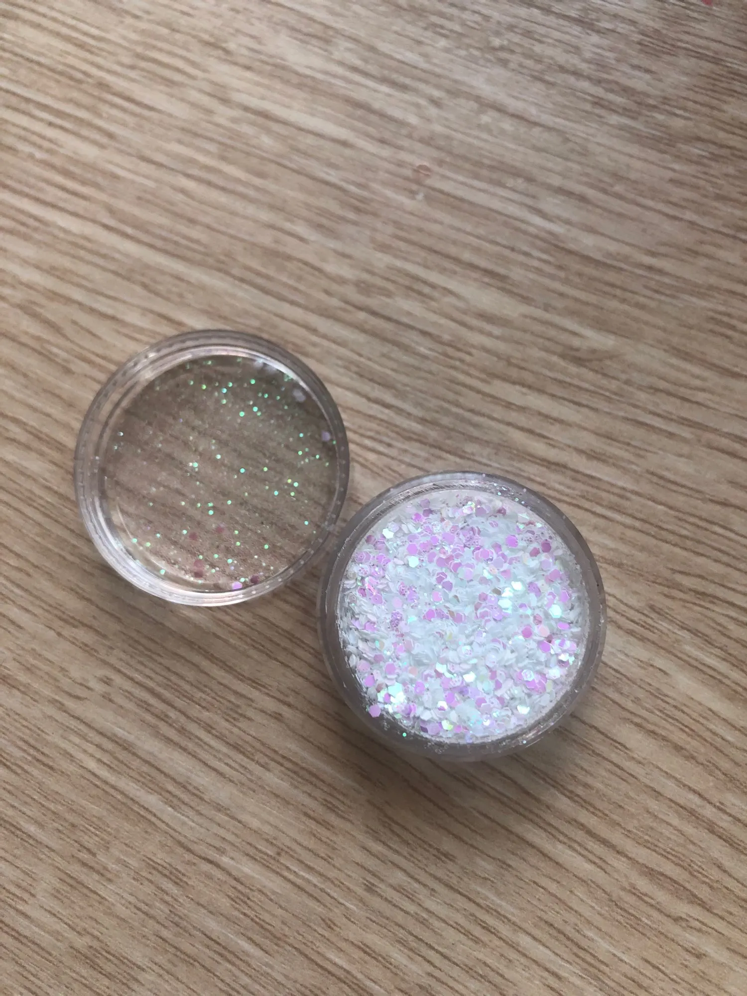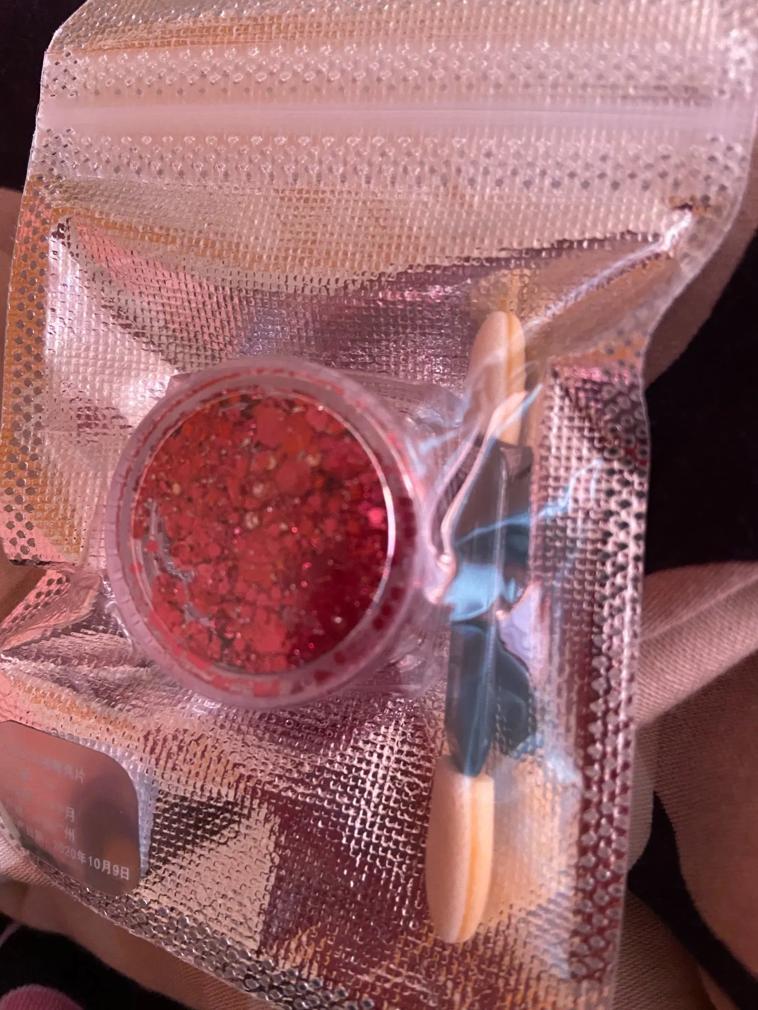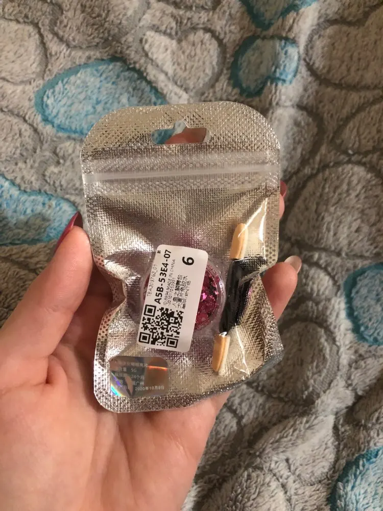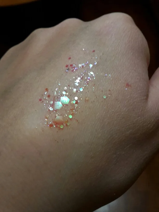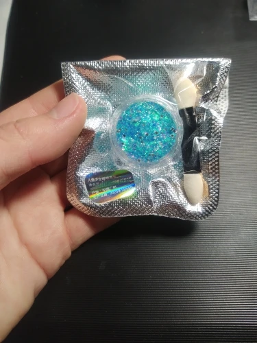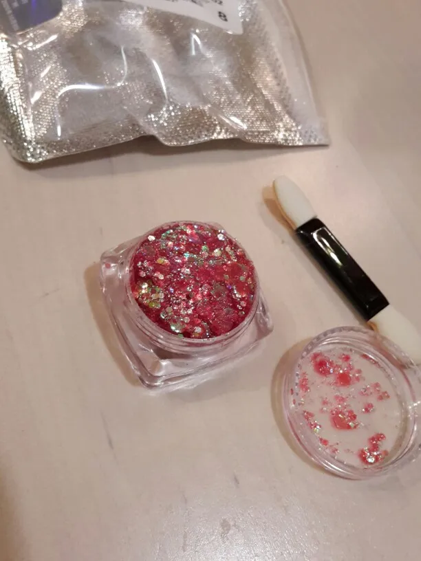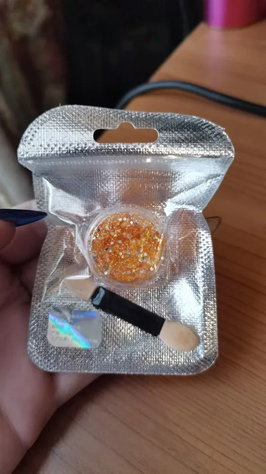 Пришли примерно за месяц. Цвет очень красивый. Блестки достаточно крупные, но я думаю если делать какой-нибудь мейк, аля эйфория, то это вообще очень хороший продукт. Пахнет в большую сторону вкусно, но слабо. В комплекте шел апликатор. Думаю, если бы тут было бы больше клейкой основы, было бы получше, но я довольна этими блестками. Рекомендую и буду заказывать еще