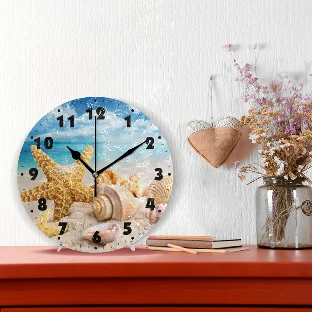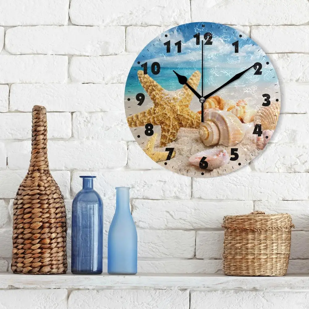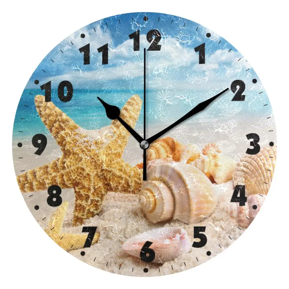 Морские ракушки, круглые Настенные часы, бесшумные часы на батарейках для гостиной, настольные часы, не тикают, морские звезды, настенные часы, Арт