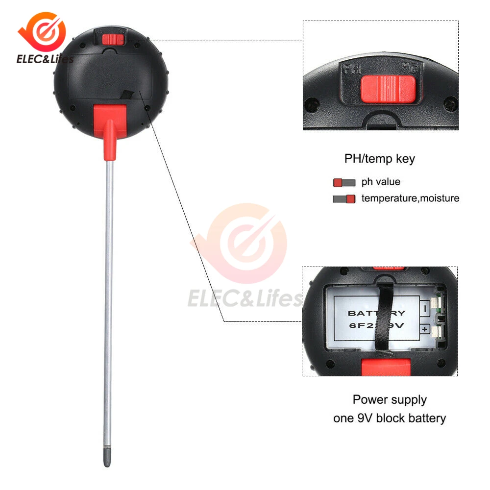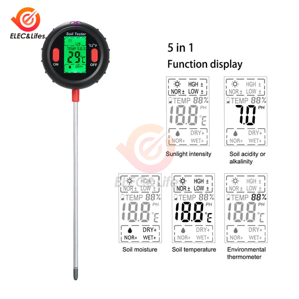 5 в 1 Набор для испытаний почвы может проверить влажность почвы, температуру, влажность, светильник и pH! Вы можете понять потребности роста растений, измерив содержание влаги и температуру почвы, независимо от того, правильно ли освещаются растения, кислотность и Щелочность почвы подходят для вашего растения. (Аккумулятор 9 в не входит в комплект). Дизайн легкий и портативный, легко носить с собой для использования на открытом воздухе, Идеальный набор инструментов для испытания почвы с влагометром, светильник, измеритель ph для домашних растений, сада, лужайки и фермы.