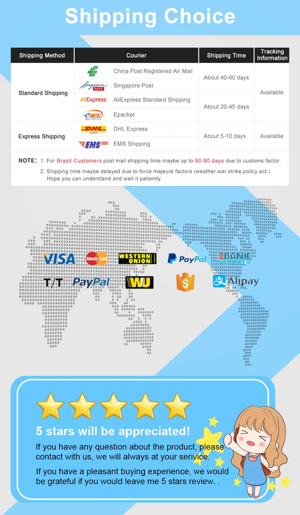 Быстрая доставка• Обещаем отправить товар в течение 5 дней после оплаты.• Вы получите товары в течение 7-40 дней, как правилоГарантия покупателя• Гарантия на один год для возврата или замены• 24X7 профессиональная предварительная консультация и послепродажное техническое решениеПоложительные отзывы• Уважаемый покупатель, пожалуйста, оставьте нам пять звезд положительный отзывы, если вы удовлетворены нашей продукцией.