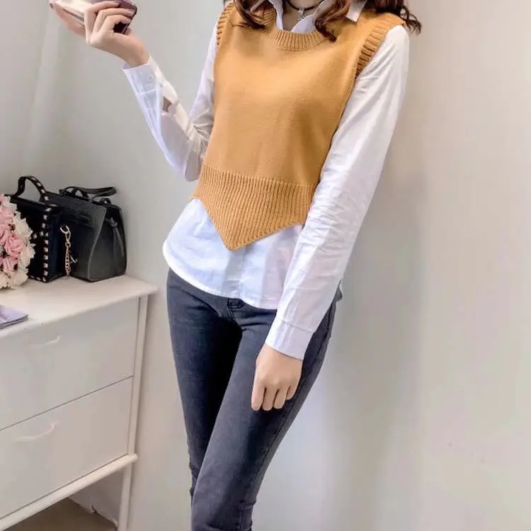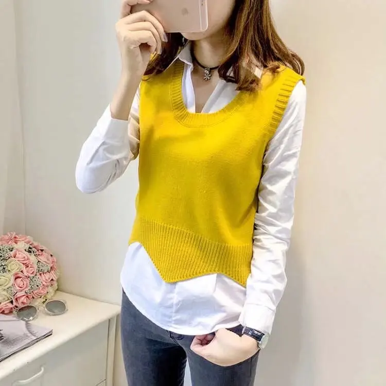 Короткий жилет, однотонный, с круглым вырезом, Женский вязаный свитер без рукавов, пуловер, весна-осень 2021