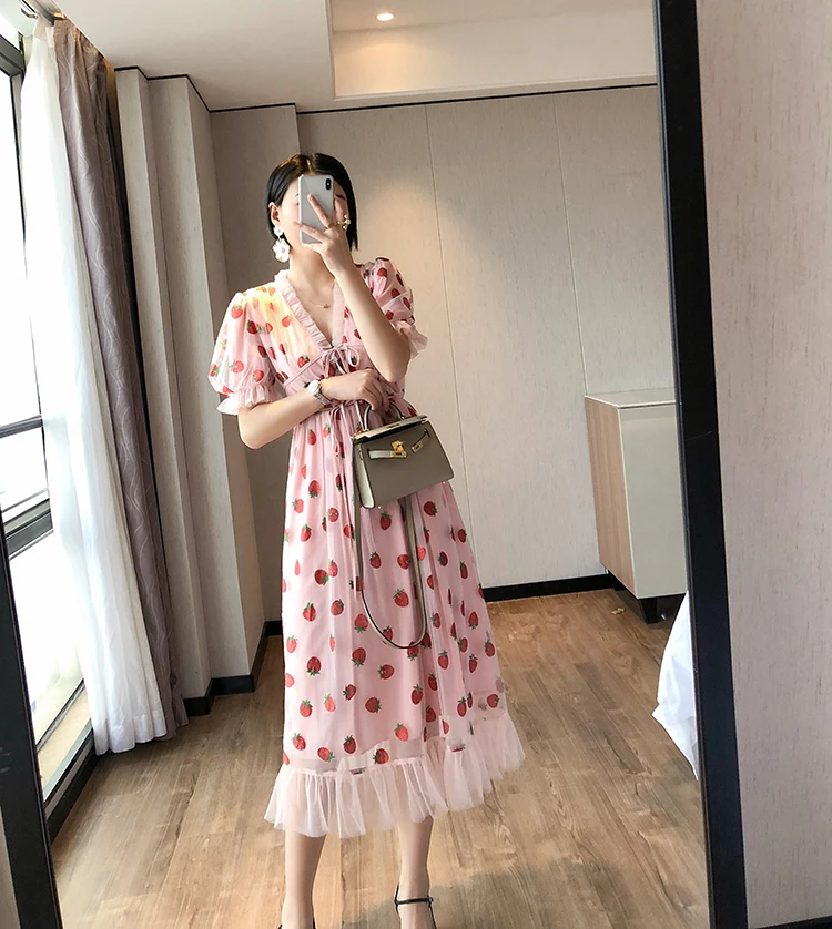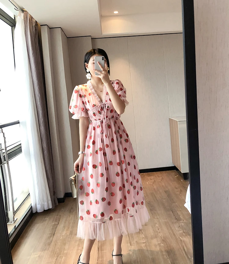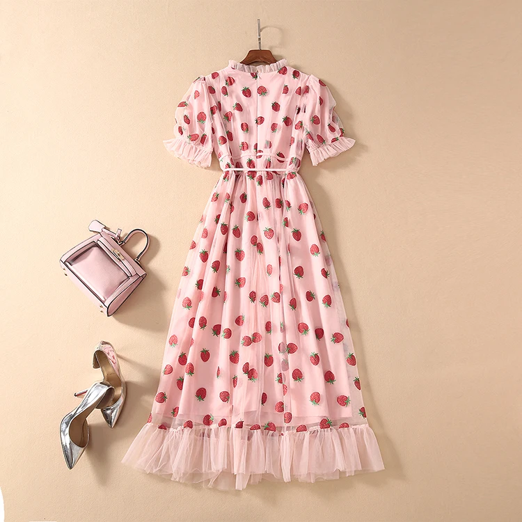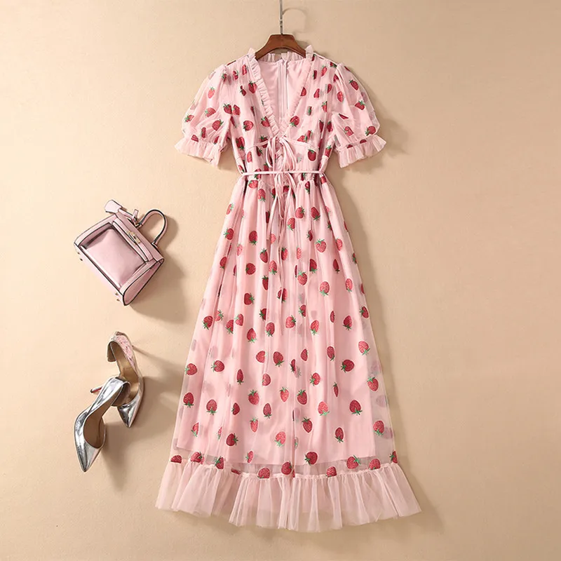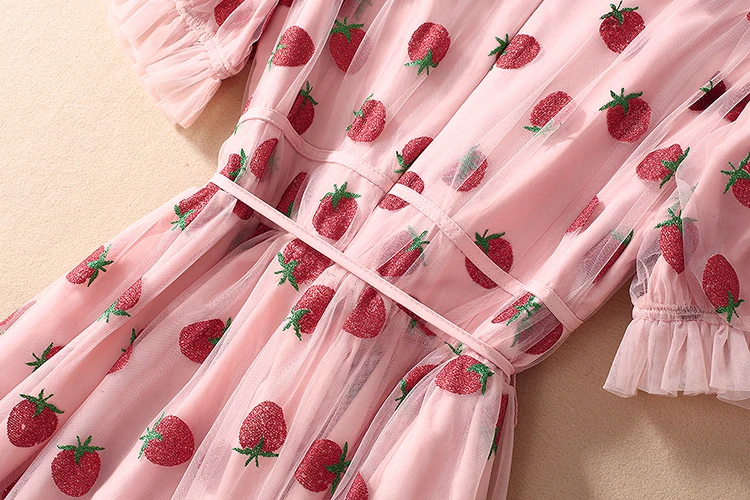 Женское Сетчатое платье макси, с бриллиантами, стразы, клубнично-розовое, короткое, с пышным рукавом, с V-образным вырезом, на шнуровке, с бантом, для подиума