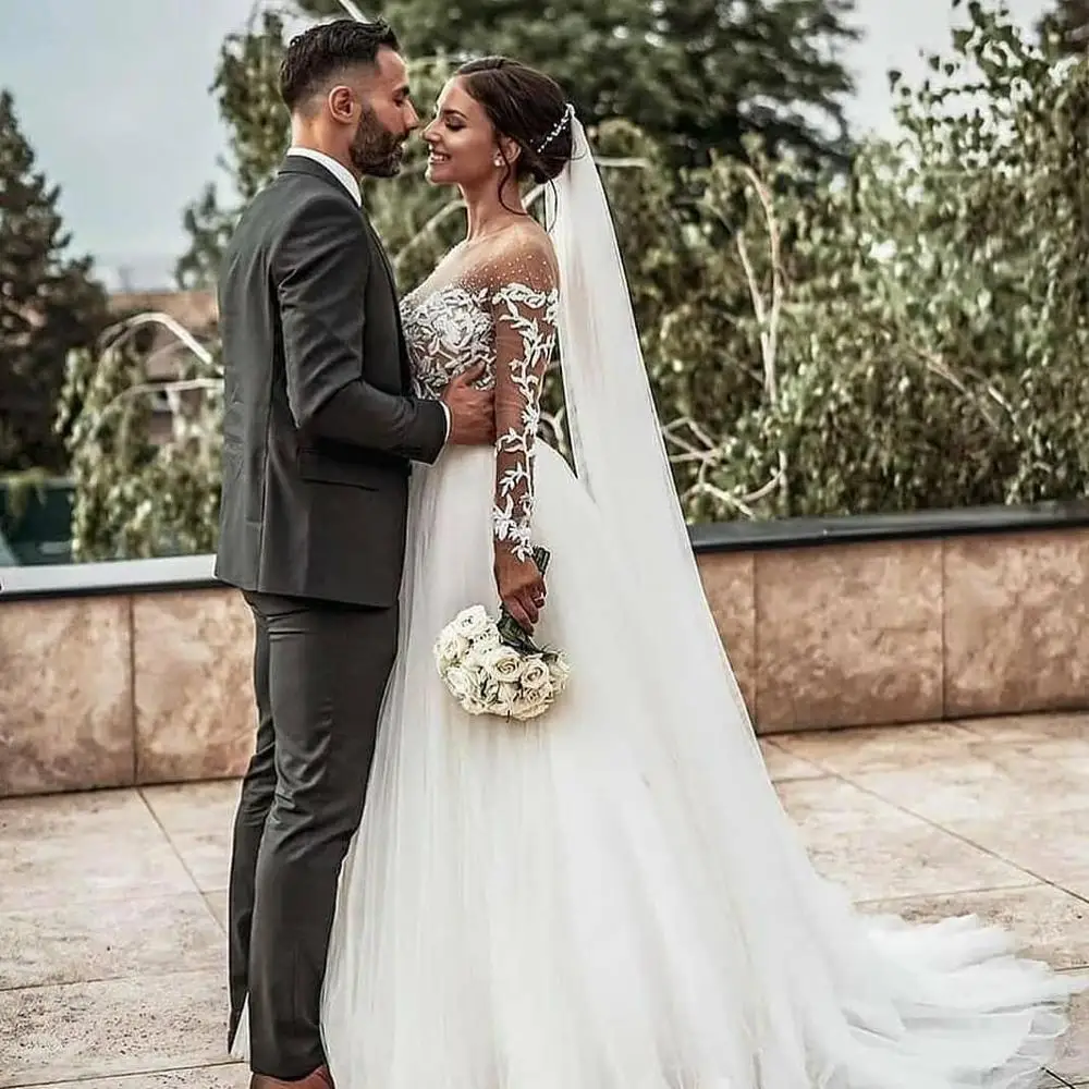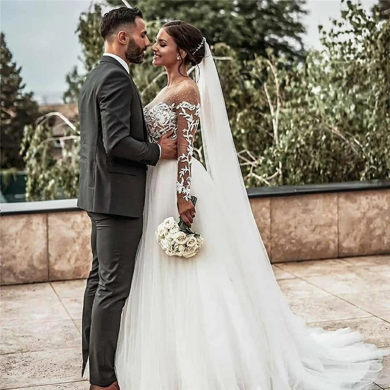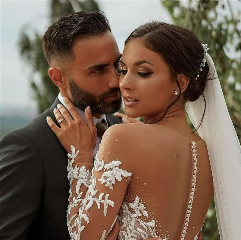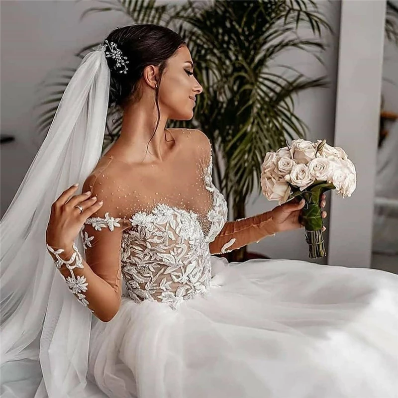 Романтические кружевные свадебные платья Booma с бисером, 2020 Прозрачные Свадебные платья с длинным рукавом и вырезом под юбку