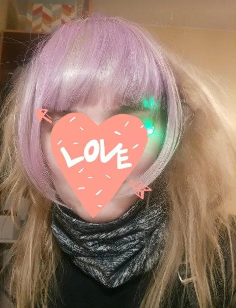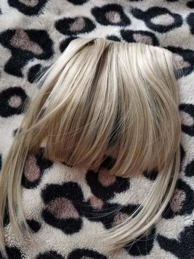 По челке видно, что она не натуральная, но для вечеринки в самый раз. Цвет чёлки, которая мне пришла, ещё светлее моих волос (мой цвет виден на хвостиках). Можно подкрасить. На моем фото нанесён тонирующий мелок.