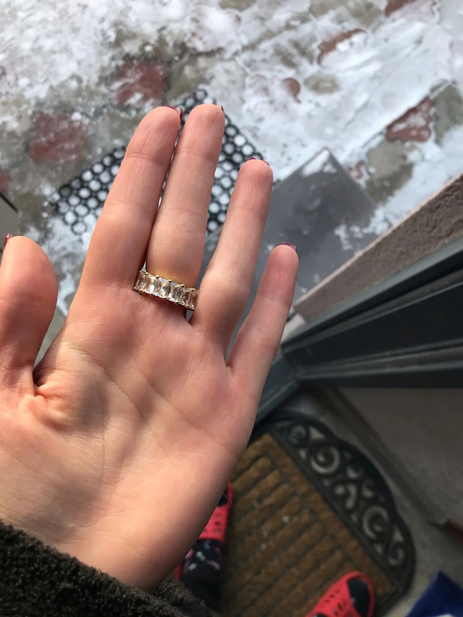 Кольцо красивое, но, мешает очень , ежедневно и даже дома его не поносишь, потому что очень мешает. За счёт того, что камни в нем выпирают.Цвет с золотыми кольцами не сочетается. И размер 6 это только на средний палец( жаль, что меньше нету