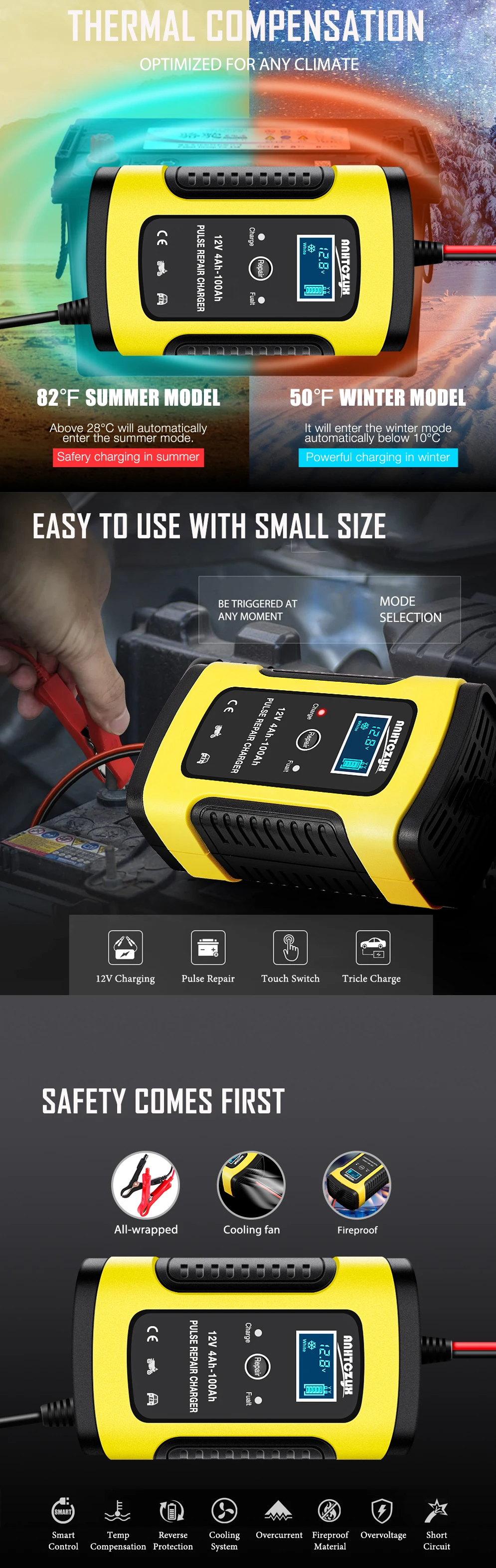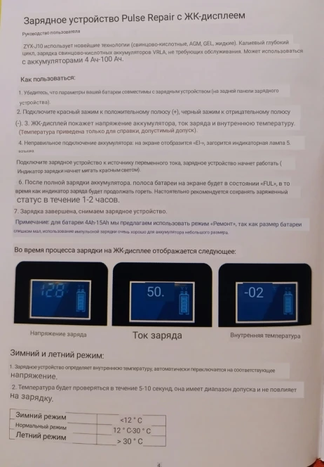 быстрая доставка, работает вроде нормально, есть зимний/нормальный/летний режим, с разными токами, устройство их выбирает само, показывает вольты, амперы и температуру аккумулятора, также есть режим восстановления аккумулятора, пока его не проверял, попробую весной на полумертвом мотоциклетном