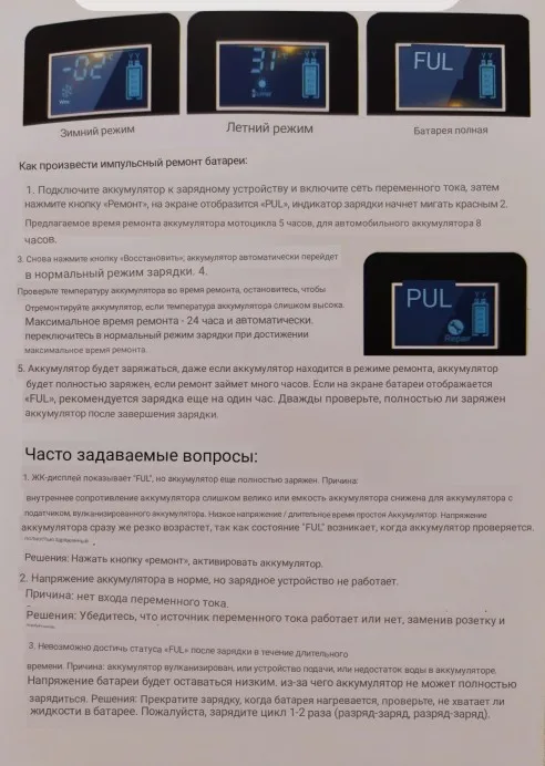 Отличное зарядное устройство , работает , пришло быстро ! Единственное , не корректно показывает температуру ! А так все ок ! Вольтаж точный , заряжает быстро , охлаждение работает всегда! Импульсное восстановление тоже работает , держит повышенное напряжение при восстановлении , выше 15 вольт , так и должно быть ! Именно в этом режиме происходит дисульфатация , очищение пластин от солей !
