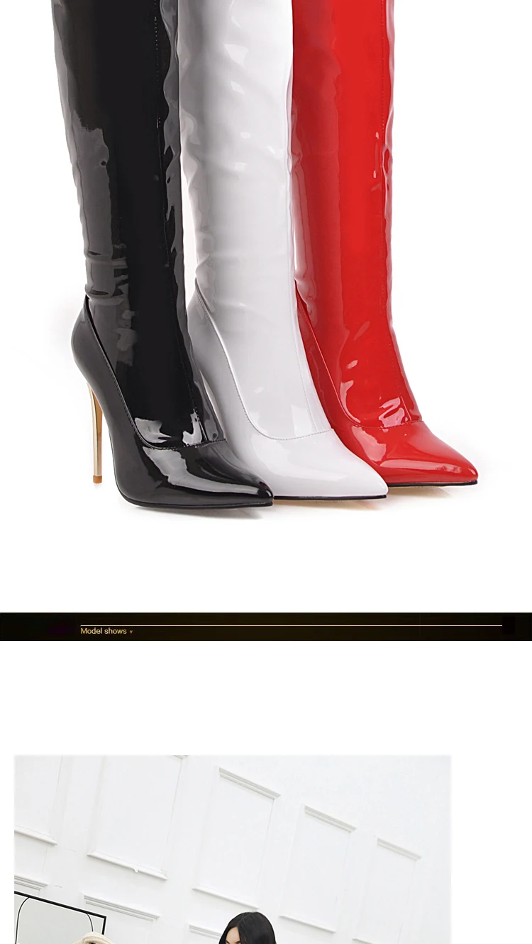 Размер: 34-48 (клиенты и друзья, которым нужно приобрести 47 ярдов или 48 ярдов, Пожалуйста, разместите сообщение о заказе или свяжитесь со службой поддержки клиентов) Цвет: черный, красный, белый Ткань: лакированная кожа Материал подошвы: нескользящая резиновая подошва Внутри: плюш Высота каблука: 10 см Высота голенища: 37,5 см Окружность трубки; 34 см