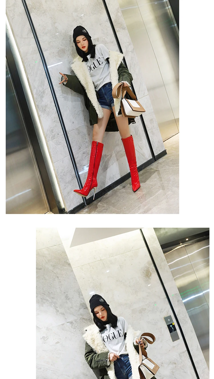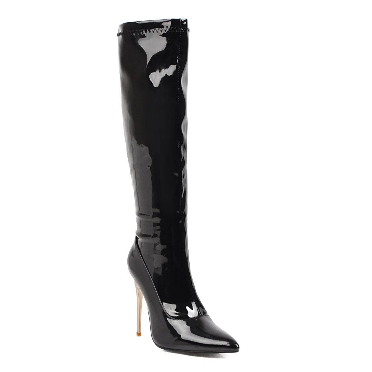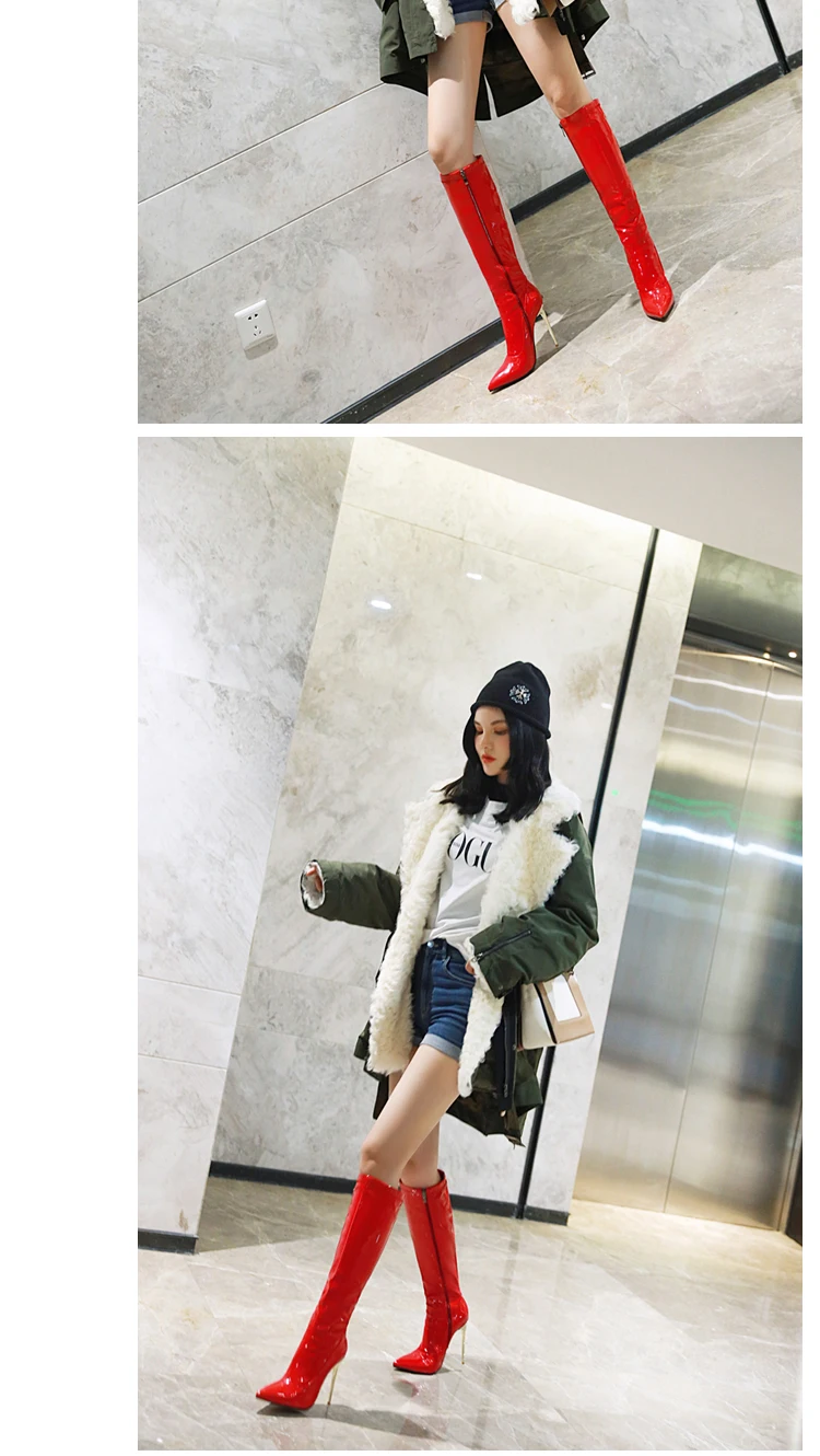 Женские сапоги большого размера из лакированной кожи на тонком каблуке зимняя теплая женская обувь из PU искусственной кожи с острым носком сапоги до колена на боковой молнии, 48 ярдов