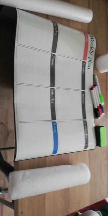 Пришло за 3 недели. Упаковка очень хорошая. Достаточно пупырчатой пленки. Тонкие мнущиеся магнитные листы упакованы в плотный поролон, а внутри свертка сердечник из того же поролона - точно не помнётся. Лист Week Planner магнитится отлично на холодильник. Маркеры в комплекте пишут хорошо. Губка в комплекте стирает хорошо.