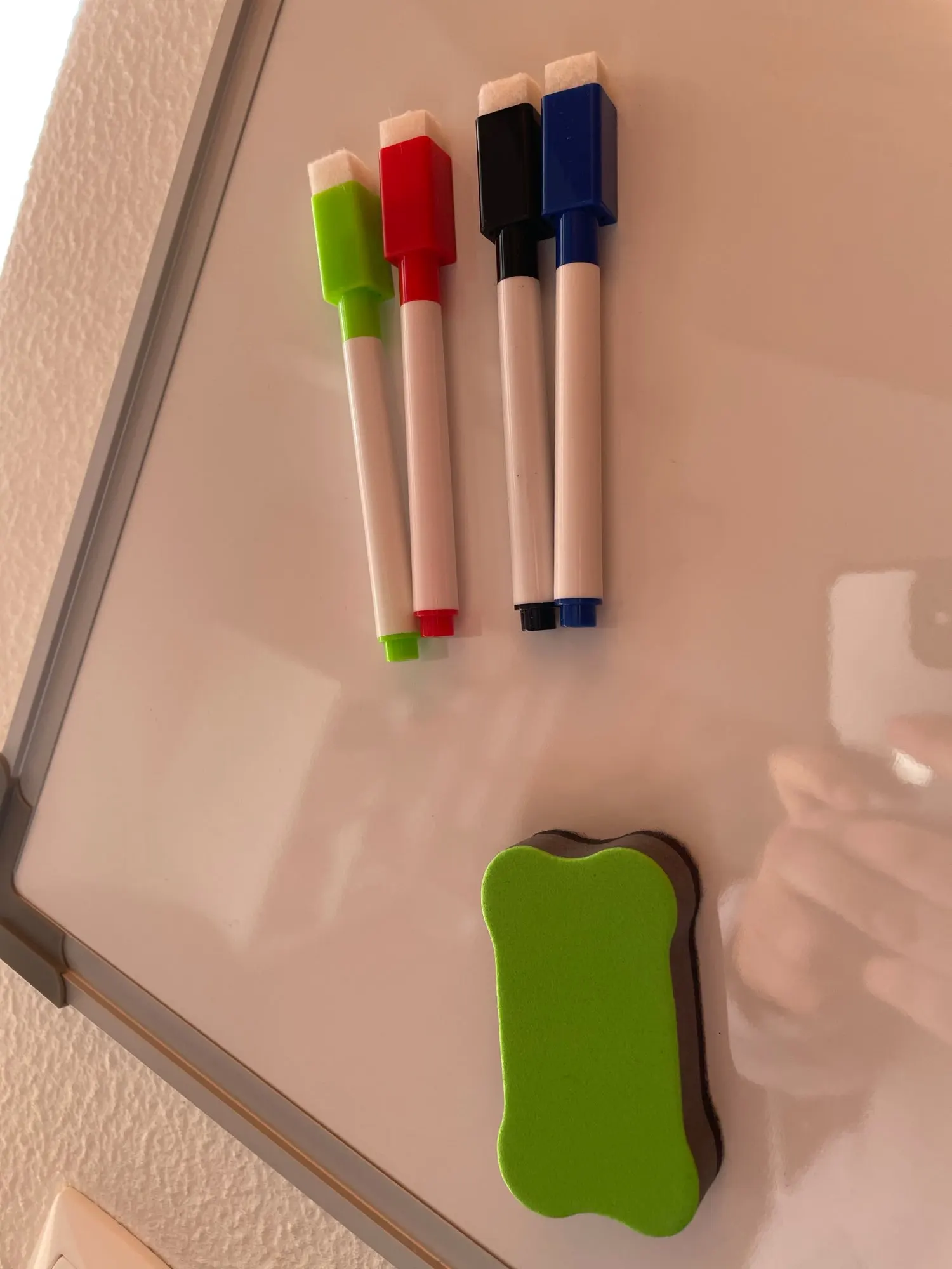 Он хорошо прикреплен к холодильнику магнитом. 4 маркера и ластик приходят, они пишут и стирают хорошо.
