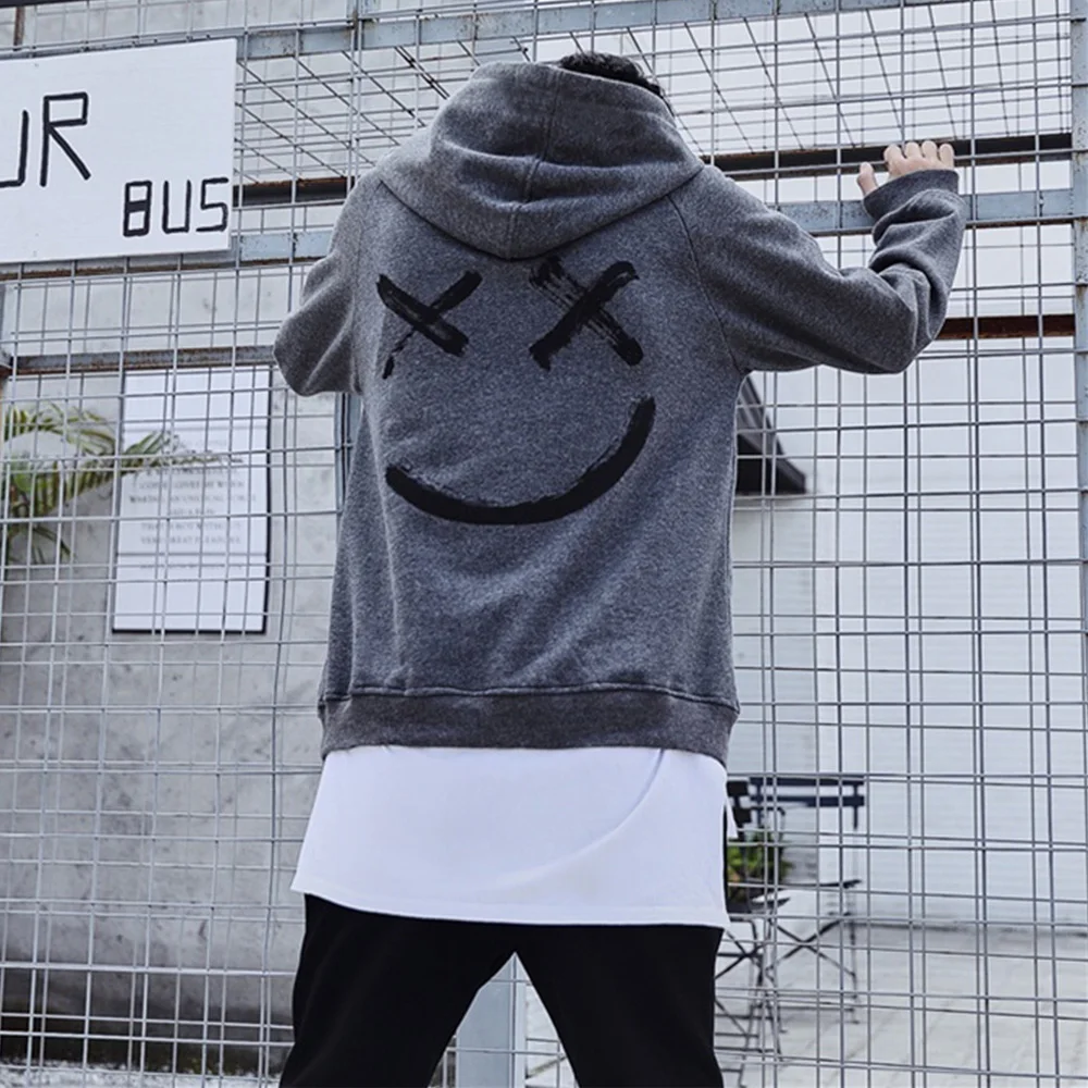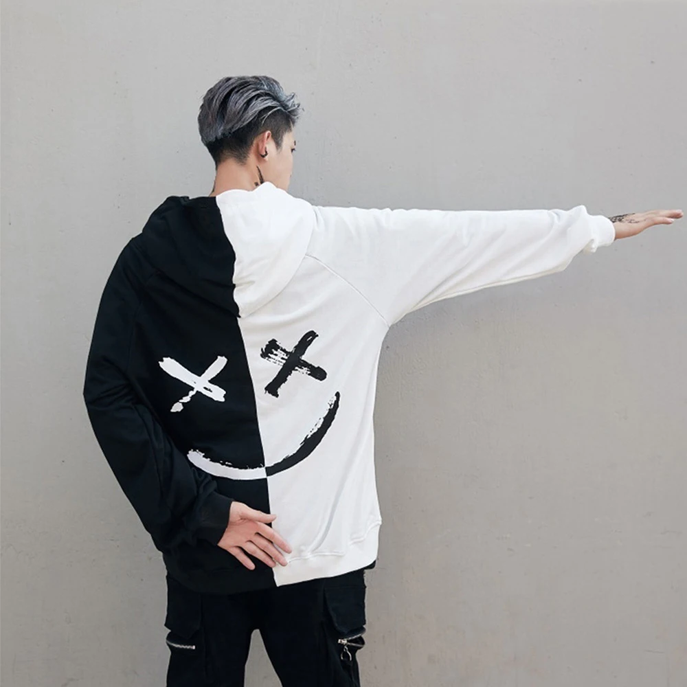 Толстовка с капюшоном для мужчин и женщин, пуловер с длинным рукавом и принтом улыбающегося лица, Свитшот оверсайз в стиле пэчворк, уличная одежда в стиле хип-хоп