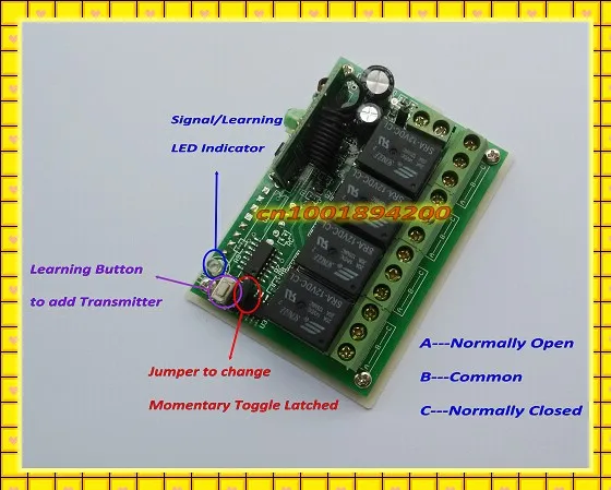1. Рабочее напряжение: DC12V -/+ 10% 2. Ток: Стандартный ≤ 10 мА, рабочий ≤ 128 мА 3. Рабочая температура: -10'C-+ 60'C 4. Частота приемника: 315 МГц/433,92 МГц 5. Чувствительность приема:-105дБ 6. Выходное состояние: значение для переключения 7. Максимальная нагрузка: реле 10А, резистивная нагрузка ≤ 8А, Индуктивная нагрузка ≤ 3A 8. Размер платы приемника: 68 × 48 × 13 мм 9. Чехол Размеры: 75 × 55 × 30 мм Тип кодирования: код обучения, добавить передатчик с помощью кнопки обучения на приемнике Выходное состояние: регулируется перемычкой на плате приемника, Мгновенный ---------- джемпер на «M & Mid Pin» Переключение --------------- Перемычка «T & Mid Pin» Защелкивается -------------- забирать джемпер или джемпер на 1 Pin-код Мгновенный ------------ нажмите кнопку передатчика A, реле приемника A Включено, отпустите кнопку A; Реле приемника A выключено, то же, что и B/C/D. 4CH являются независимыми. Переключение ------------------ нажмите кнопку передатчика A 1 раз, реле приемника A Включено, нажмите кнопку A снова, реле приемника A выключено, то же, что и B/C/D. 4CH являются независимыми. Защелкивается ------------------ Нажмите кнопку передатчика A, реле приемника A Включено, реле B/C/D выключено. Нажмите кнопку передатчика B, реле приемника B включено, реле A/C/D выключено. Нажмите кнопку передатчика C, реле приемника C включено, реле A/B/D выключено Нажмите кнопку передатчика D, реле приемника D включено, реле A/B/C выключено. Он также имеете в виду. Запирается только на 1CH. И у него часто будет 1CH. Обучающий код Входная мощность для приемника. Продолжайте нажимать кнопку обучения, пока не появится светодиодный индикатор. Затем нажмите на передатчик любую кнопку, светодиодный индикатор выключен, затем нажмите любую кнопку передатчика, вы услышали ответ реле, это означает, что обучение успешно. Очистка кода Удерживайте кнопку обучения на приемнике до тех пор, пока светодиодный индикатор не выключается, это означает, что код был успешно очищен.