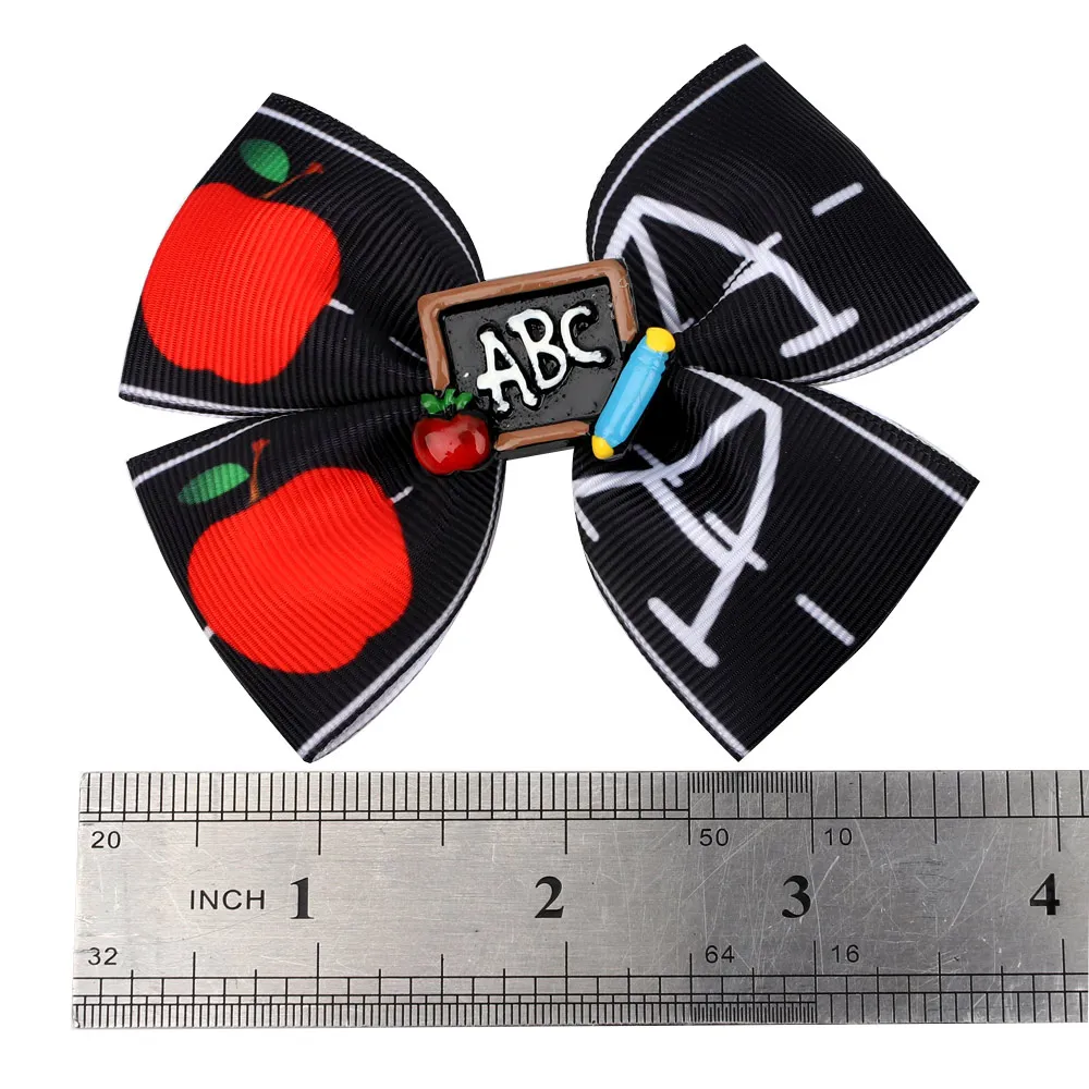 2 шт.лот Back To School 3,5 дюйма Grosgrain ленты лук заколки для волос для девочек, с рисунком, с черным бантом заколки для волос для детей, повязка на голову