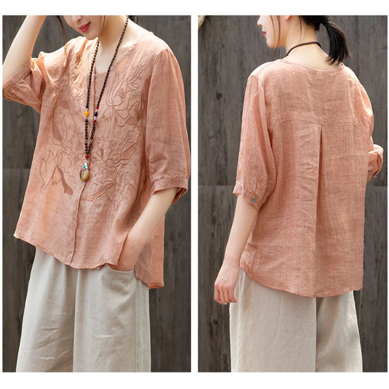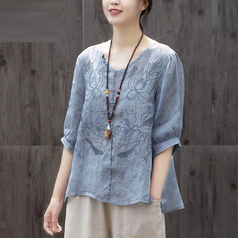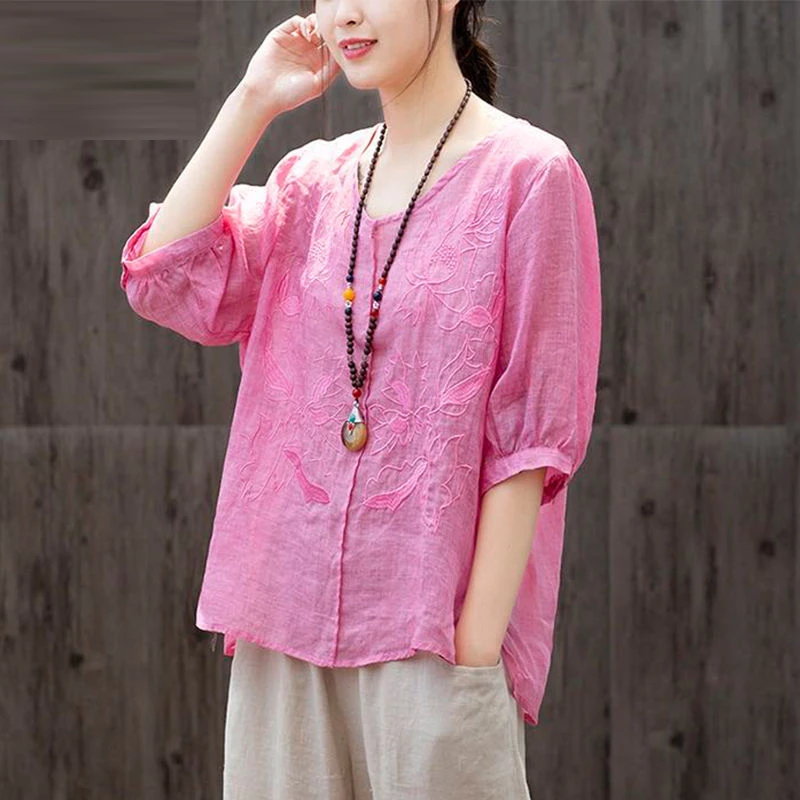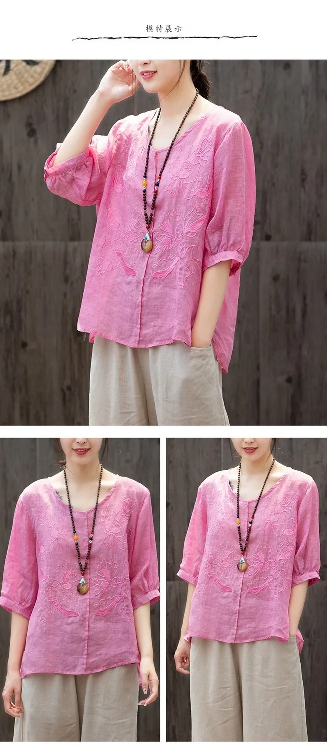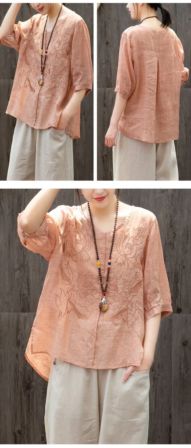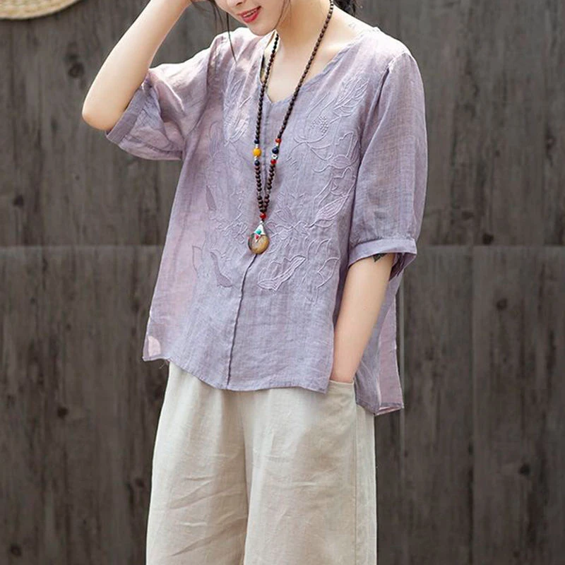 Женская свободная футболка с коротким рукавом и V-образным вырезом, винтажный топ из хлопка и льна с вышивкой, размера плюс, M116, на лето
