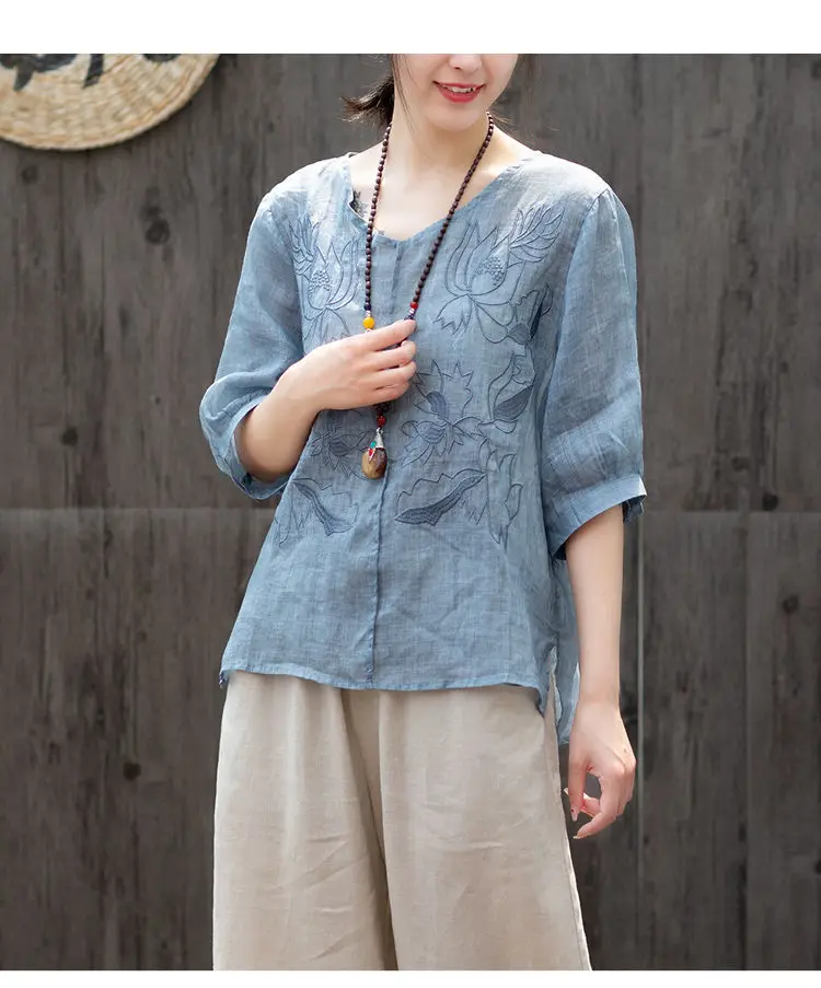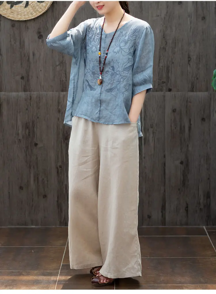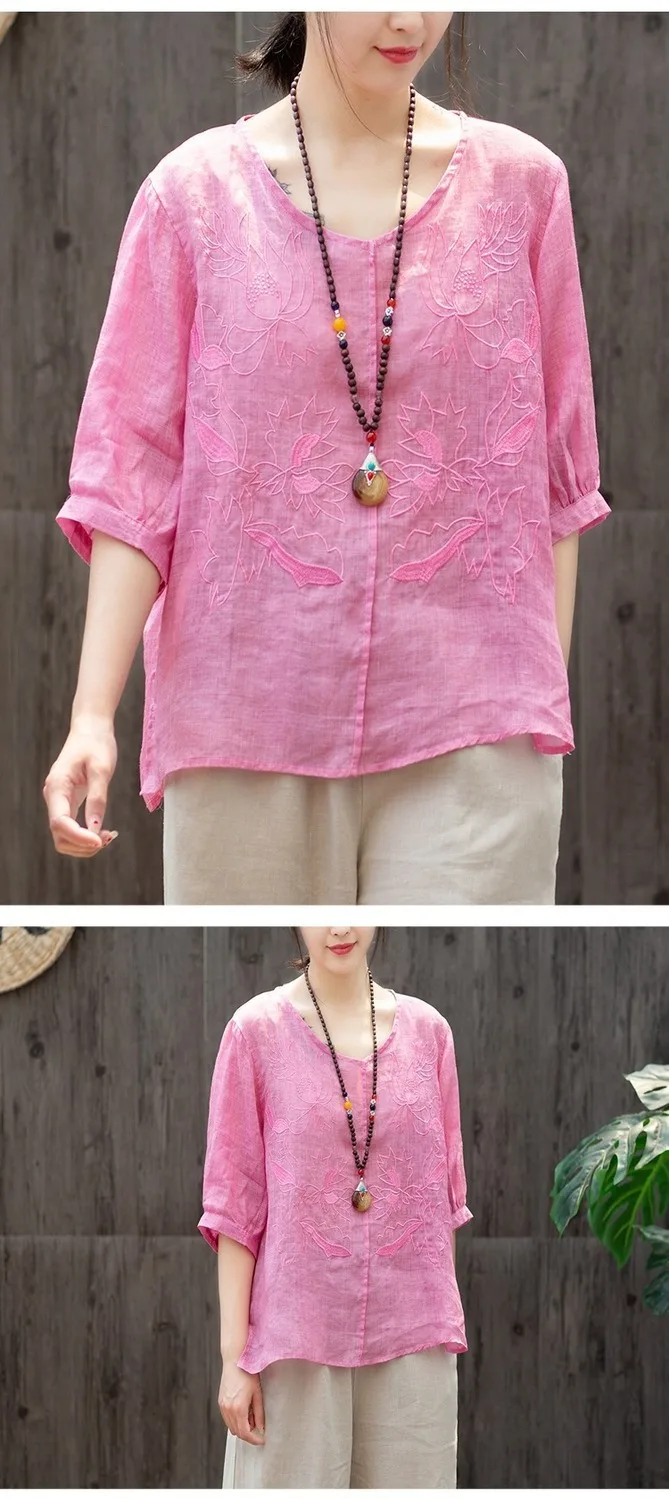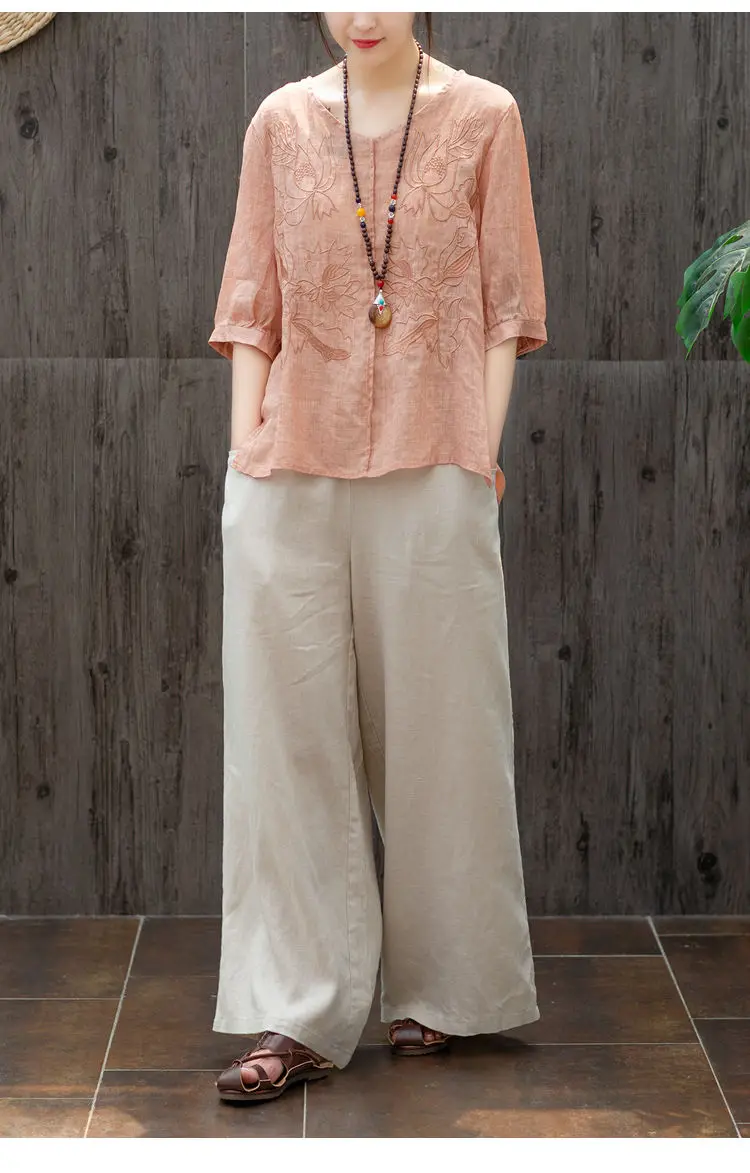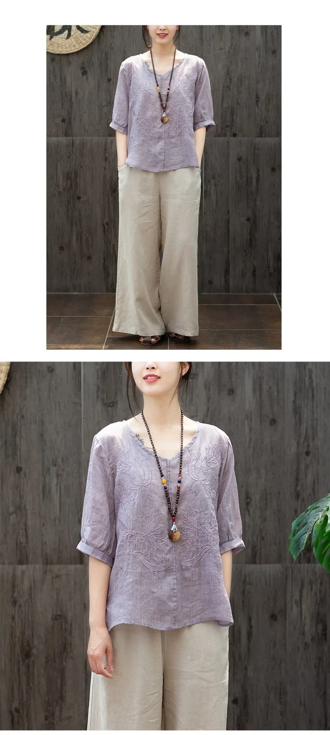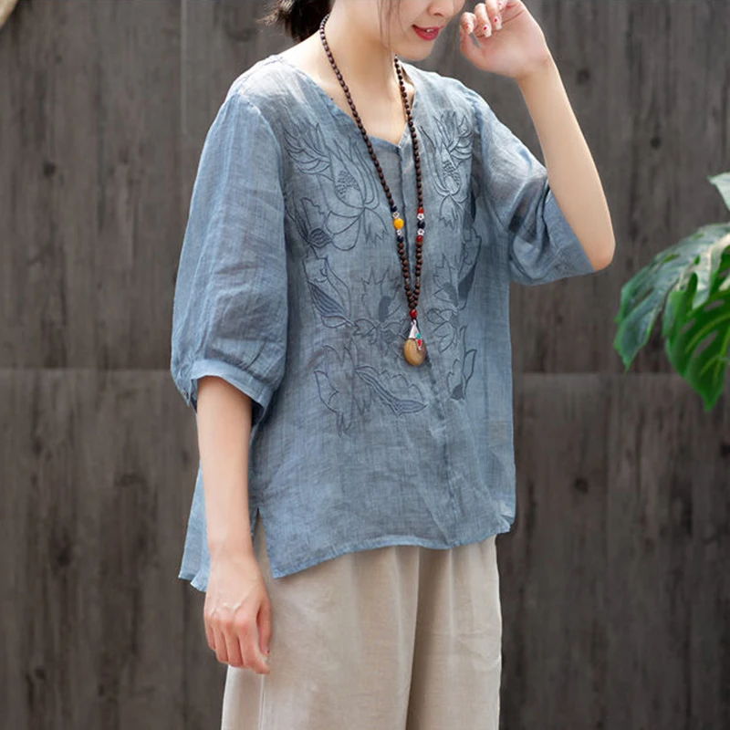 Женская свободная футболка с коротким рукавом и V-образным вырезом, винтажный топ из хлопка и льна с вышивкой, размера плюс, M116, на лето