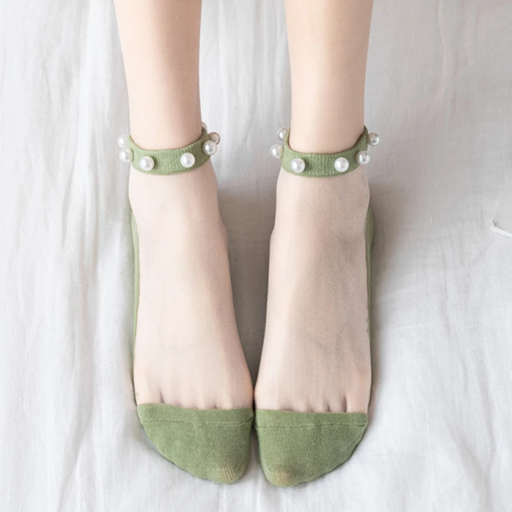 Носки женские прозрачные с жемчугом, тонкие Дышащие Короткие однотонные, шелковые невидимые хлопковые, до щиколотки, летние