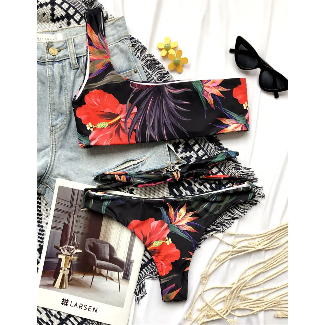 Новинка 2021, цветочный женский купальник бикини на одно плечо, женский купальник, комплект бикини из двух предметов, купальный костюм, купальный костюм для женщин V2352