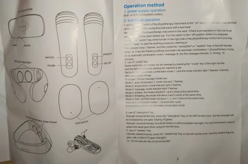 Работает, точечные удары довольно чуствительные на 1режиме. Тестируем дальше :) Мануал на английском, будем разбираться с режимами. Массажёр чисто для шеи, для холки не подходит, не достаёт. Работает от 2 мизинчиковых батареек.