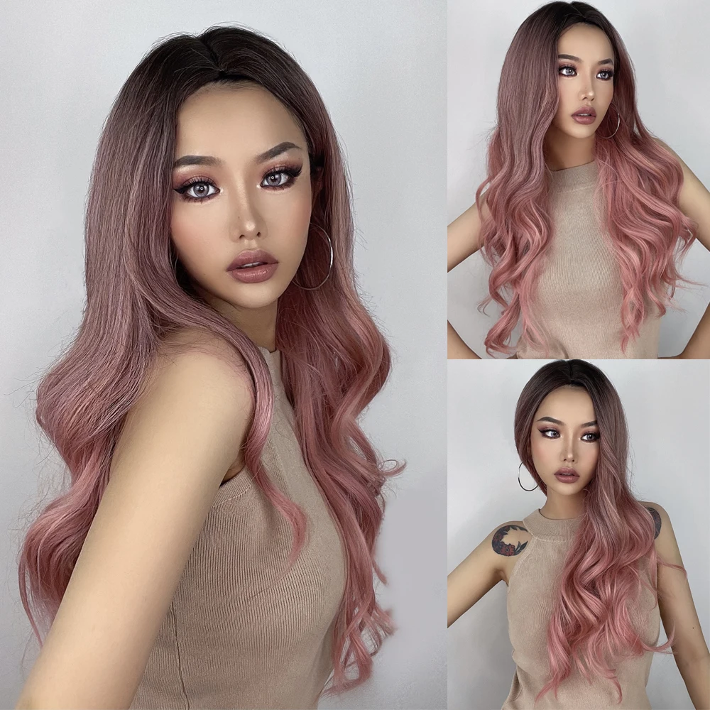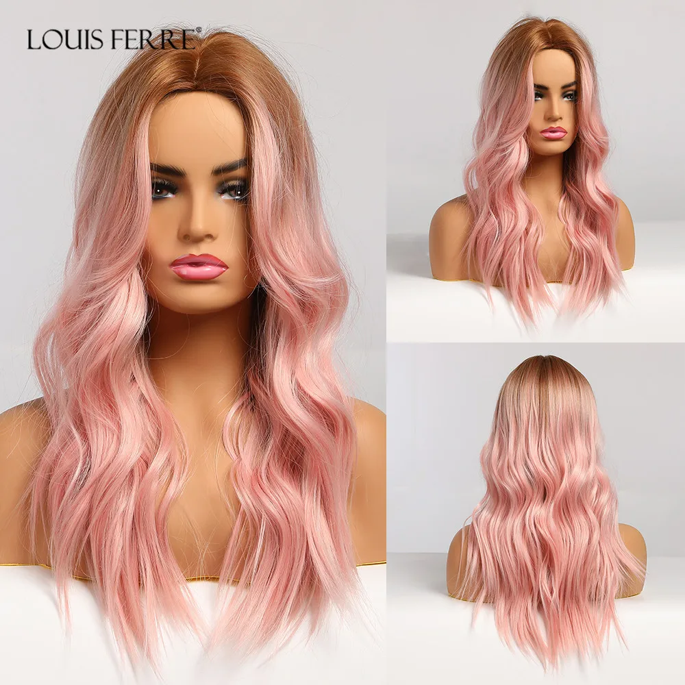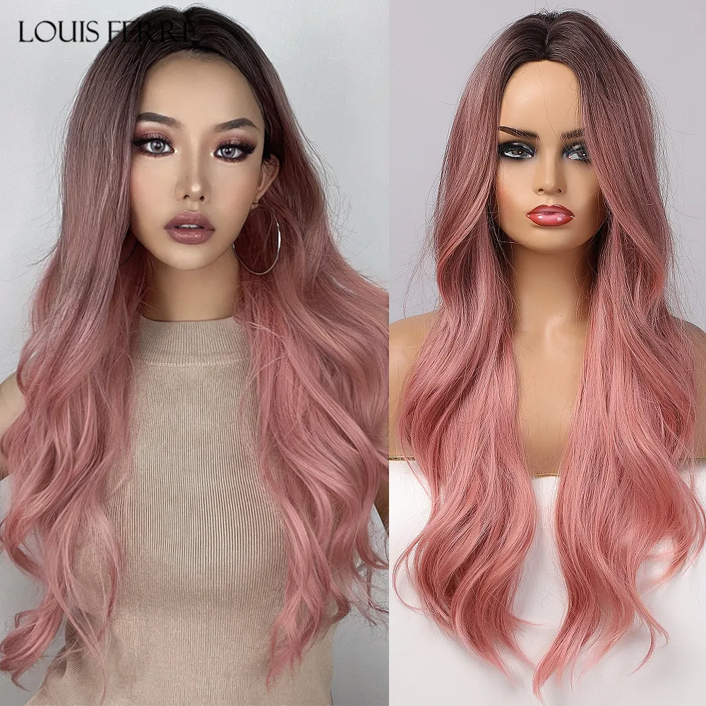 Парик LOUIS FERRE для чернокожих и белых женщин, термостойкие искусственные волосы, с длинной естественной волной, для косплея, с эффектом омбре, розовый, со средней частью