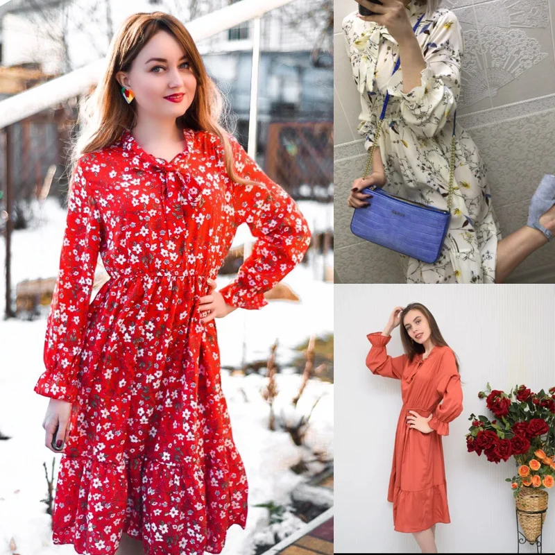 Женское шифоновое платье-рубашка средней длины, повседневное винтажное платье-рубашка с цветочным принтом, длинным рукавом и бантом в Корейском стиле на лето-осень