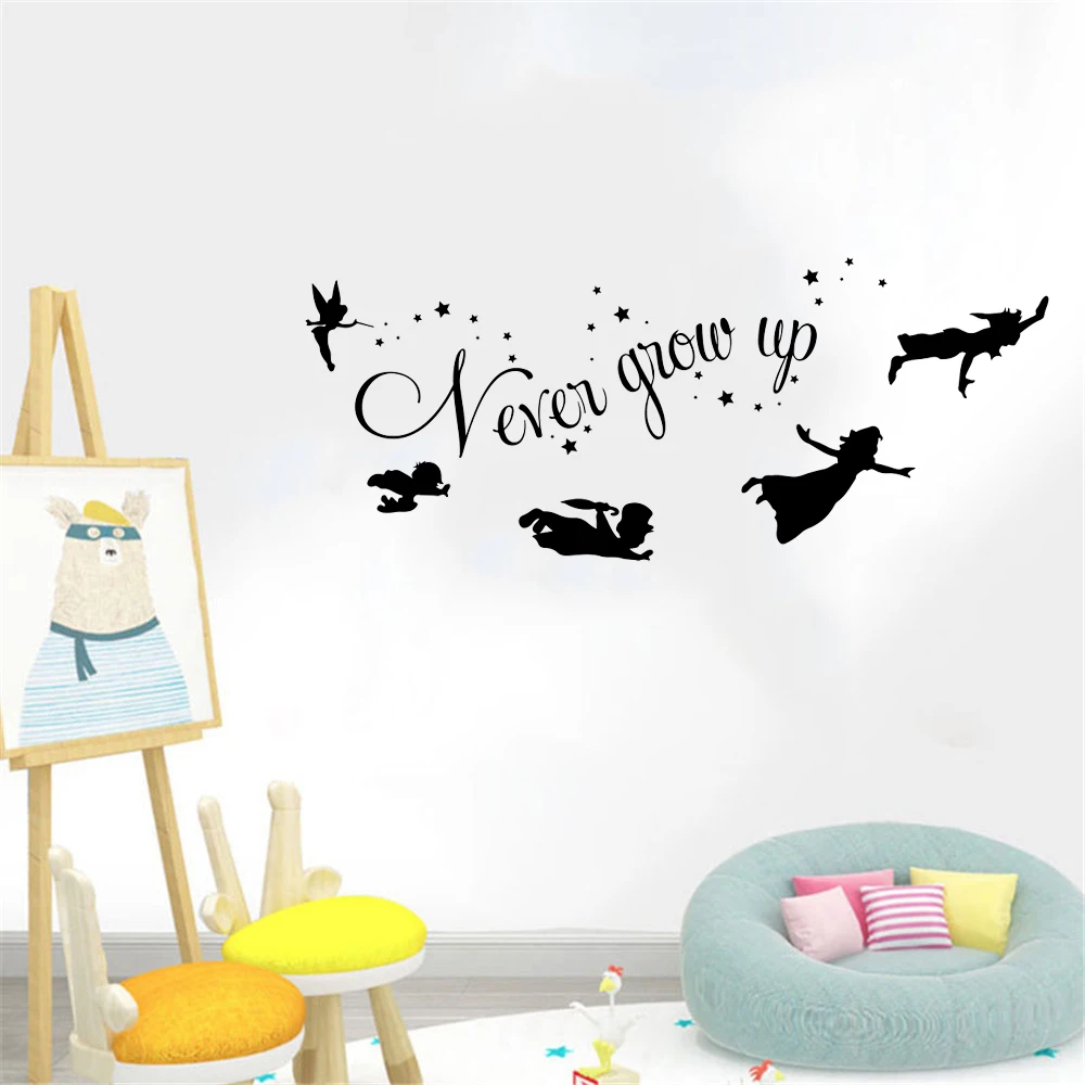 Наклейка на стену Питер Пэн, Виниловая наклейка с мотивами мультфильмов, никогда не вырастет, с цитатой, для детской комнаты, детской комнаты