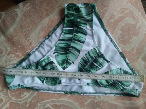 Ношу размер S, соответственно заказала S. Верх сел хорошо, даже ещё чуть место осталось, на плавках же слишком тугие швы, которые не тянутся. Верх купальника регулируется завязками на шее, обхват-железная застежка. Запаха нет.