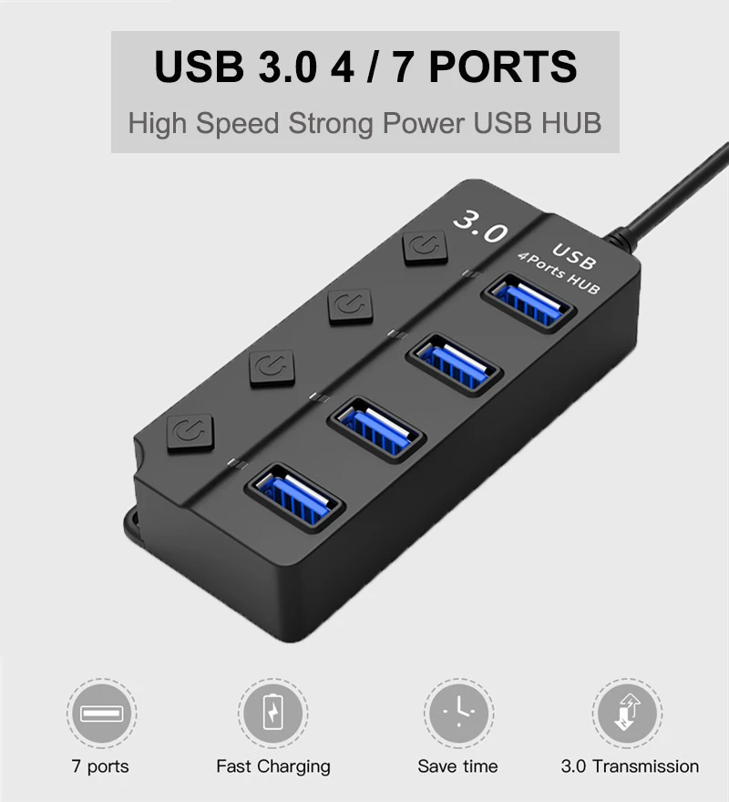 Концентратор USB 3,0 4 и 7 портов, высокоскоростной мощный usb-хаб 3,0