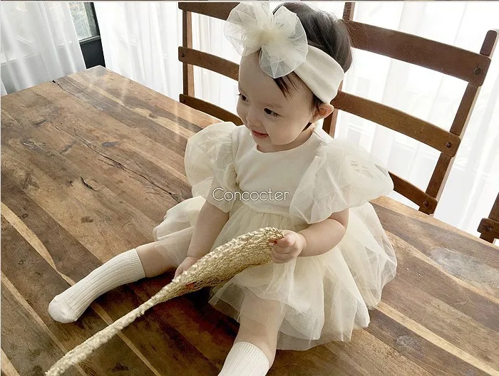 Комбинезон принцессы с коротким рукавом, на Возраст 3-24 месяца, летнее Новое корейское боди для маленьких девочек, пышное Тюлевое платье с рукавами для малышей, KF527
