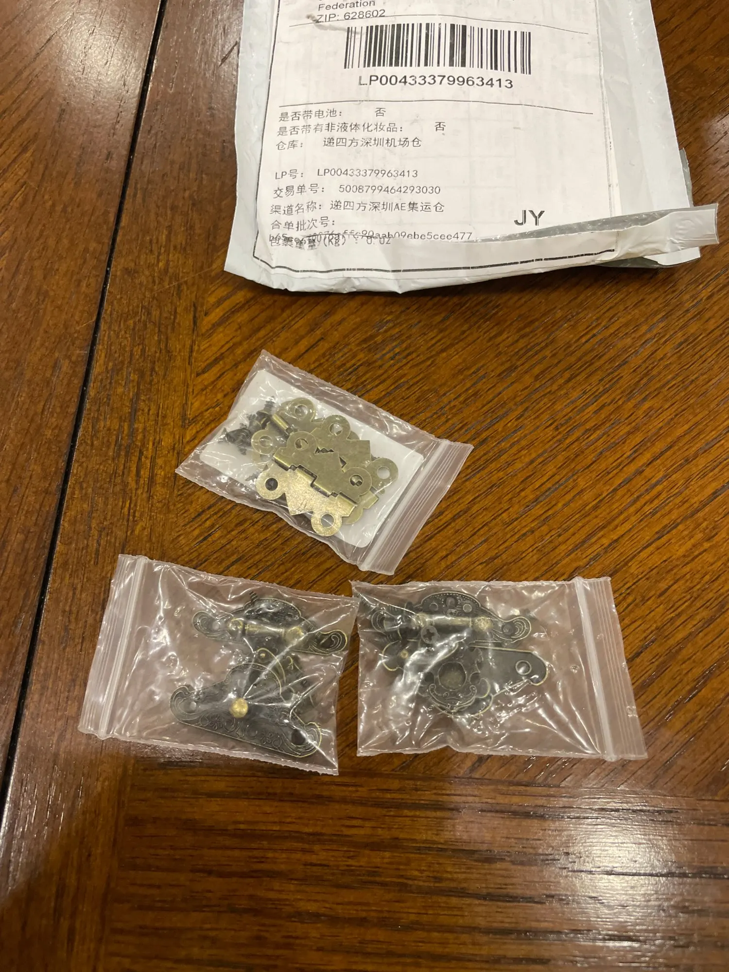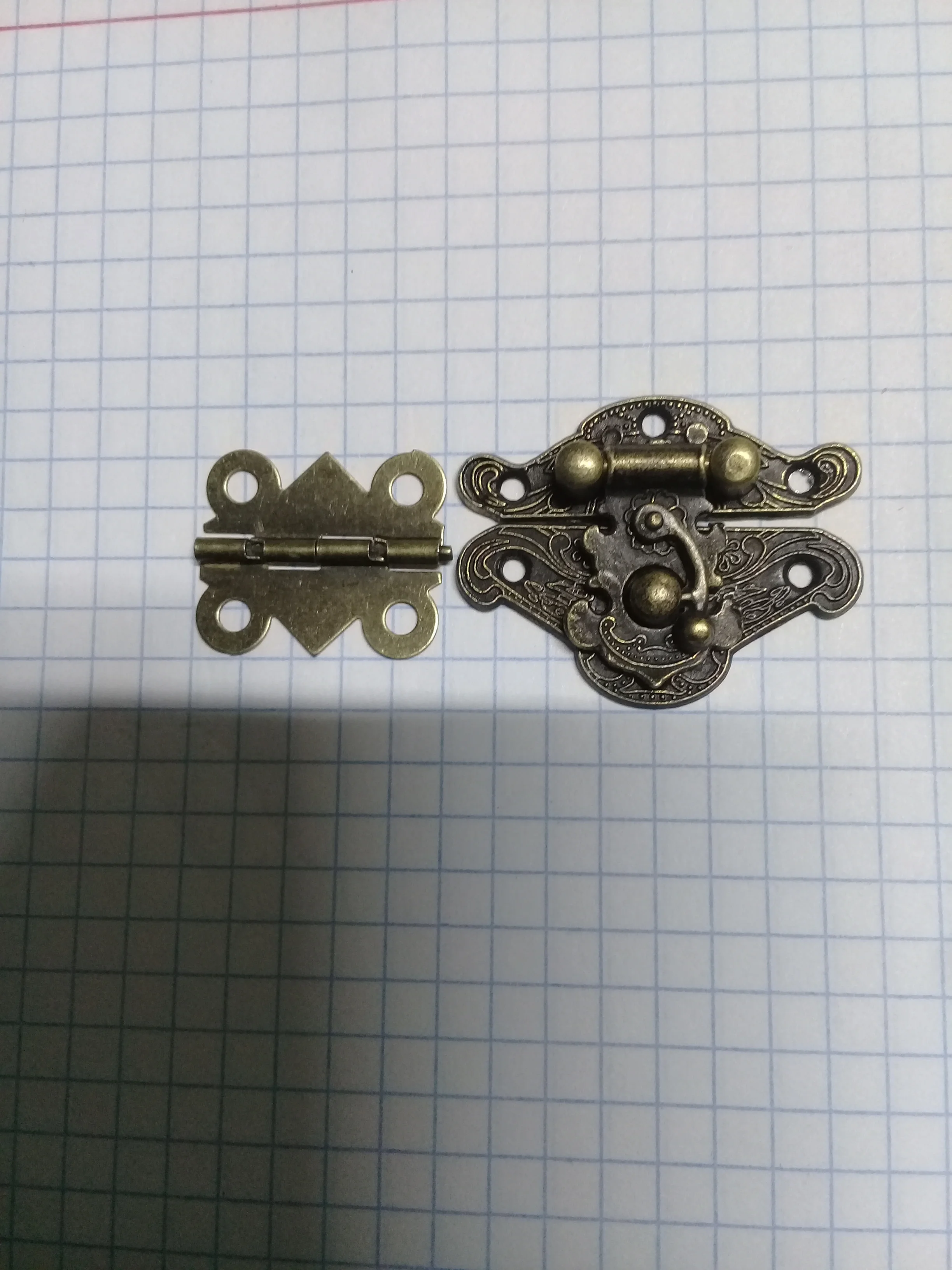 доставка около месяца. всё в отдельных пакетиках. небольшого размера. меня устраивает. замочки отличные. петли с ограничителем хода. крышка меньше 90 градусов откроется. придётся доработать надфелем. шурупы на петлях короткие. из мягкого дерева вырвет. поменяю шурупы с замками. и сами петли наверно приклею.
