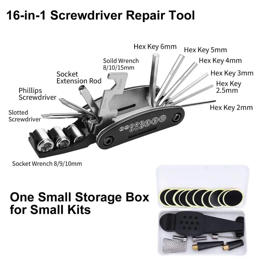 1. Этот набор для ремонта велосипеда включает в себя мини-насос высокого давления для велосипеда, Мульти-инструмент отвертки биты, 10 шт предварительно склеенные патчи для шин, сумка для велосипедного сиденья, 2 шт. штанги для велосипедных шин и спортивная игла для надувания спортивных шаров.