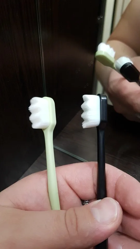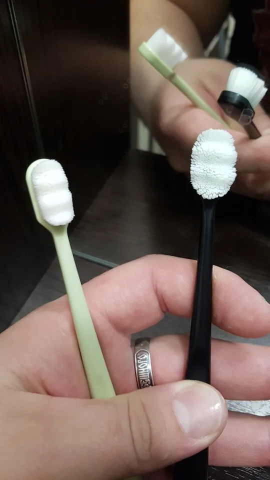 Щетки очень мягко чистят, непривычно, как будто ватой протираешь зубы. Но все вычищают, присутствует небольшой эффект полировки. И зубная паста сильно пенится. После нескольких дней попробовала перейти на обычную щетку, не смогла - десна стали кровоточить. Через 2 недели у одной щетки отвалилась щетина, она приклеена к основанию.