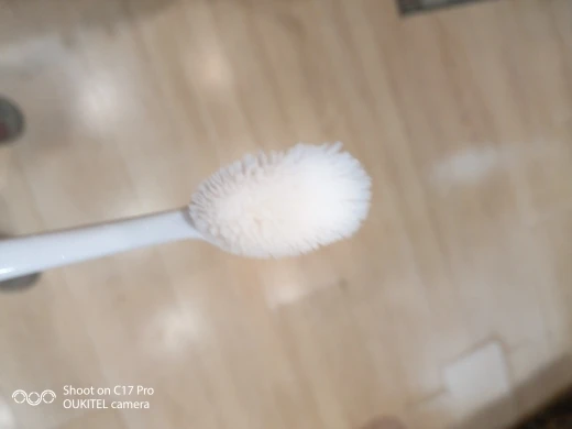 Надеялся, что за счет плотности ворсинок будет достигнута определенная жесткость. Но в итоге ощущение, что чистишь губкой. И, опять же, из-за плотности, ворс у основания будет моментально забиваться, потом не промыть. В общем смешанные впечатления. Ручка не скользит, хоть и сделана из гладкого пластика.