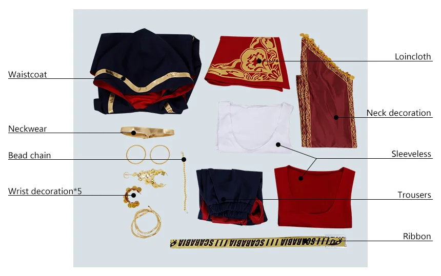 Безрукавка, тканевая ткань, брюки, без рукавов * 2, кружево, украшение на шею, украшение на запястье * 5, цепочка из бисера, пояс.