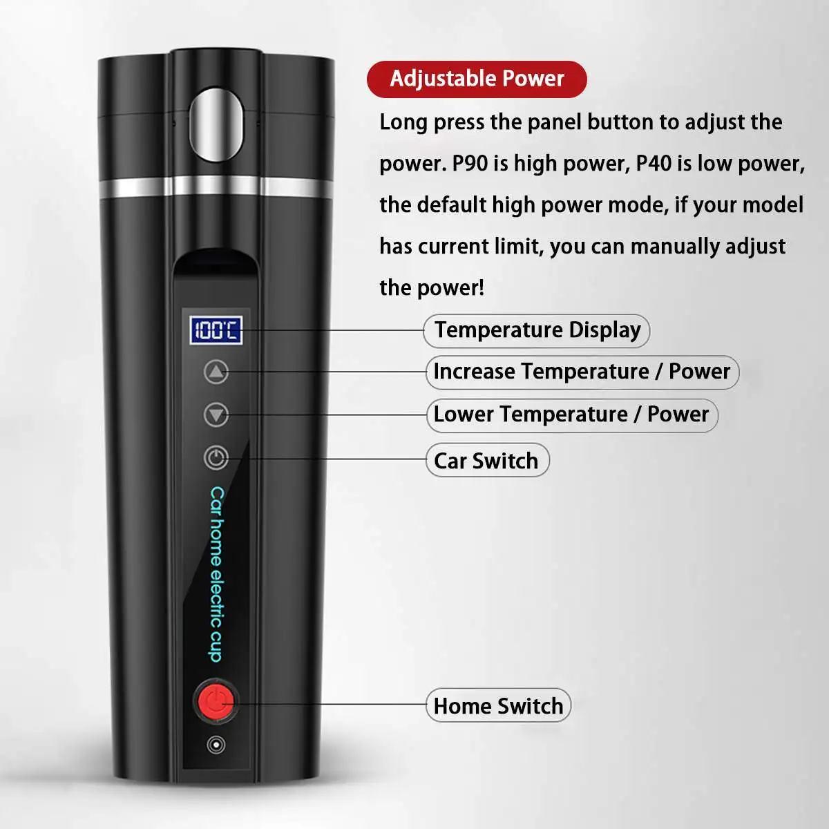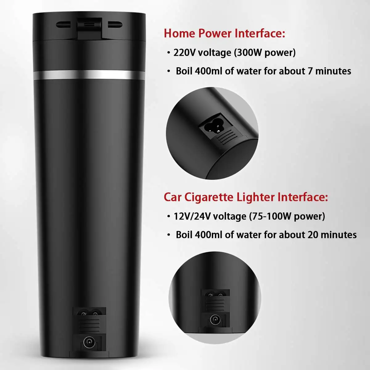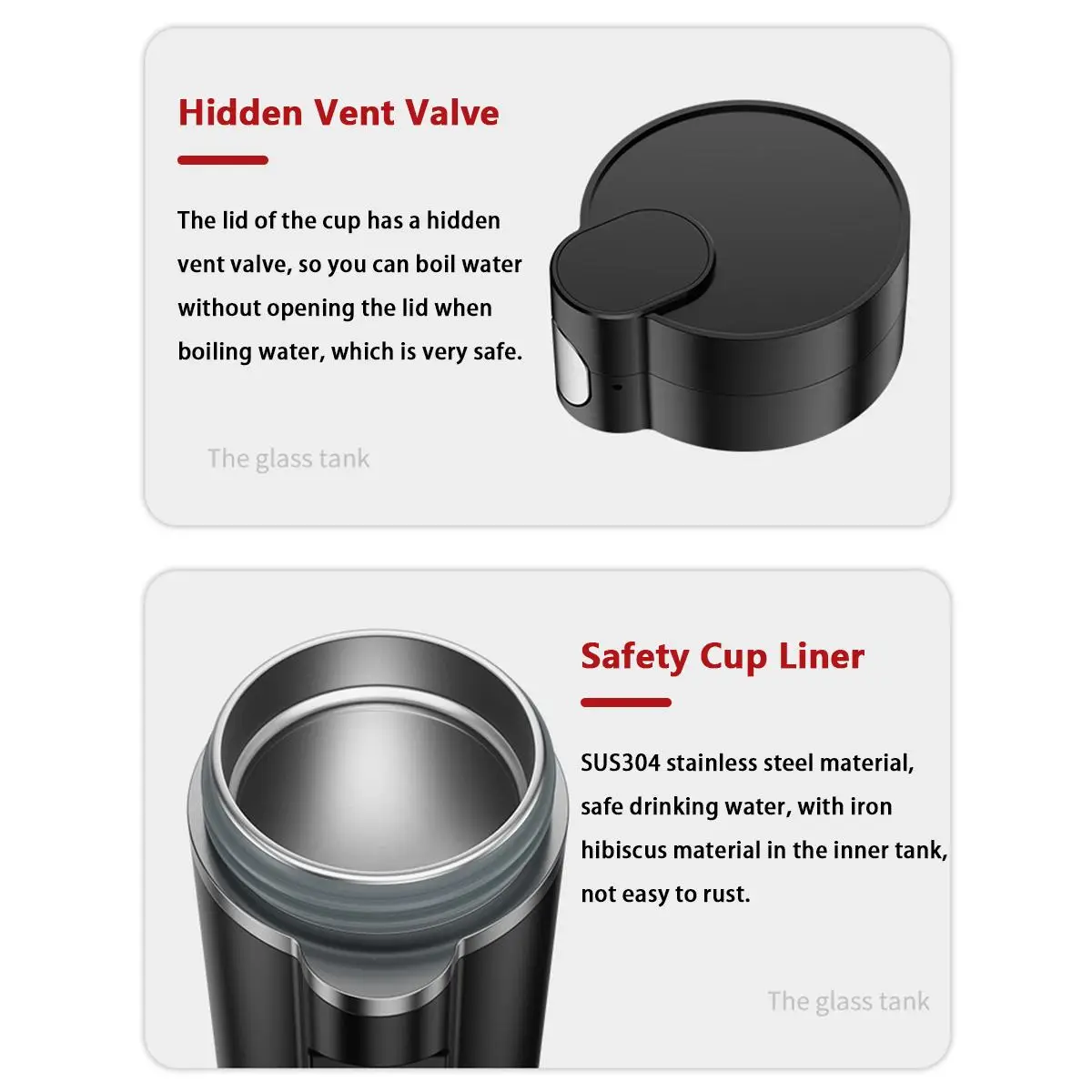 Особенности:-С использованием пищевой нержавеющей стали 304, интеллектуальный нагревательный стаканчик прочен, устойчив к высоким температурам, умно отрезан и предотвращает сухое горение.-Быстрое нагревание, 450 мл воды нагревается до 100 °C при комнатной температуре, когда в машине, и это занимает всего 20-25 минут. И скорость нагрева быстрее, когда дома.-Полностью герметичная крышка для предотвращения перелива жидкости и повышения эффективности сохранения тепла. 360 градусов вверх дном, без утечки воды.-С экраном дисплея, он может отображать температуру регулировки и регулировать питание в соответствии с источником питания. Простое и удобное управление одним ключом.-Открывание и закрытие одной рукой, простота в использовании, вы можете легко пить воду даже во время вождения.-12 В/24 В/220 В Универсальный, двойного назначения для семейных автомобилей, удобный для работы, школы, путешествий, кемпинга, пивоварения кофе, вареных яиц, подарков и детского молока.