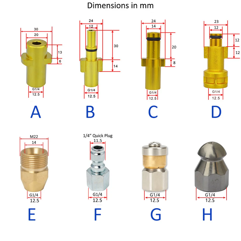Примечание: в комплект не входят адаптеры для Karcher HD/HDS, Bosch GHP, Nilfisk-KEW/WAP и т. Д., мойки высокого давления. Пожалуйста, свяжитесь с нашей службой поддержки клиентов, если вам не ясно или вам нужно больше адаптеров.