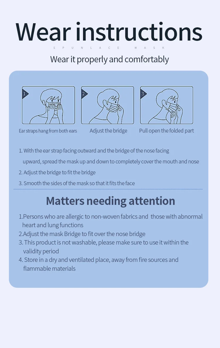 Характеристики продукта Название продукта: фильтрующая Пылезащитная маска Описание продукта: Добавьте слой фильтра с активированным углем, впитывает запахи и защищает от многослойности. Каждое дыхание свежее. Функции продукта: ветрозащитный Песок, пыль, выхлоп автомобиля, противотуманный, Подержанный дым, противотуманный, Характеристики продукта: трехмерный 3d-дизайн светильник Материал с пушистым, дышащим, мягким (умеренная мягкость, удобство ношения), гигиеничный, влагозащищенный Материал изделия: нетканый материал, выдунное из расплава полотно Сфера применения: неограниченное использование при массовых перевозках 1. Обычно мы отправляем товар в течение 8-24 часов. 2. После того, как товар будет отправлен, мы готовы помочь вам отслеживать информацию о доставке, чтобы вы всегда могли узнать местоположение и статус продукта 3. Обычно Доставка осуществляется в течение 10-20 рабочих дней (за исключением форс-мажорных обстоятельств) 4. Если ваш заказ не отображается в течение длительного времени, свяжитесь с нами, и мы поможем вам узнать об этом. Если у вас есть какие-либо вопросы, пожалуйста, сначала свяжитесь с нами и не открывайте спор, потому что каждый покупатель важен для нас. Условия продажи 1. Если вы не удовлетворены своей покупкой, вы можете запросить возврат 2. Возврат неудовлетворительного товара должен быть возвращен нам в неиспользованном состоянии в течение 30 дней, и мы вернем его после получения товара. 3. Но, пожалуйста, сохраните этикетки в целости и сохранности, товары чистые и безвкусные, в противном случае мы не примем возврат. Логистические характеристики: AliExpress Стандартная доставка