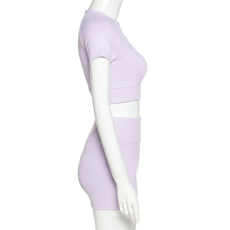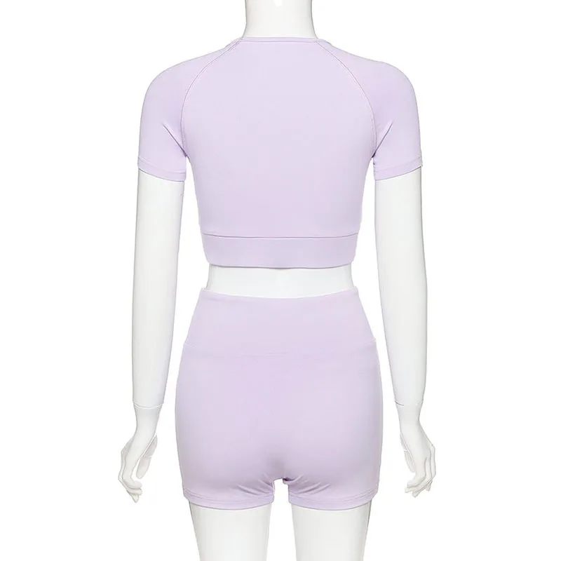 Повседневный Спортивный комплект для активного отдыха, Женский однотонный комплект из двух предметов, базовый короткий топ и шорты