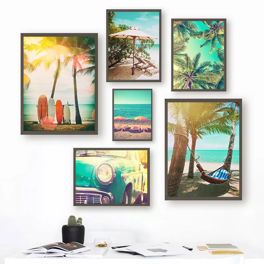 Розовая пляжная доска для серфинга, зонт, кокосовое дерево, настенн...