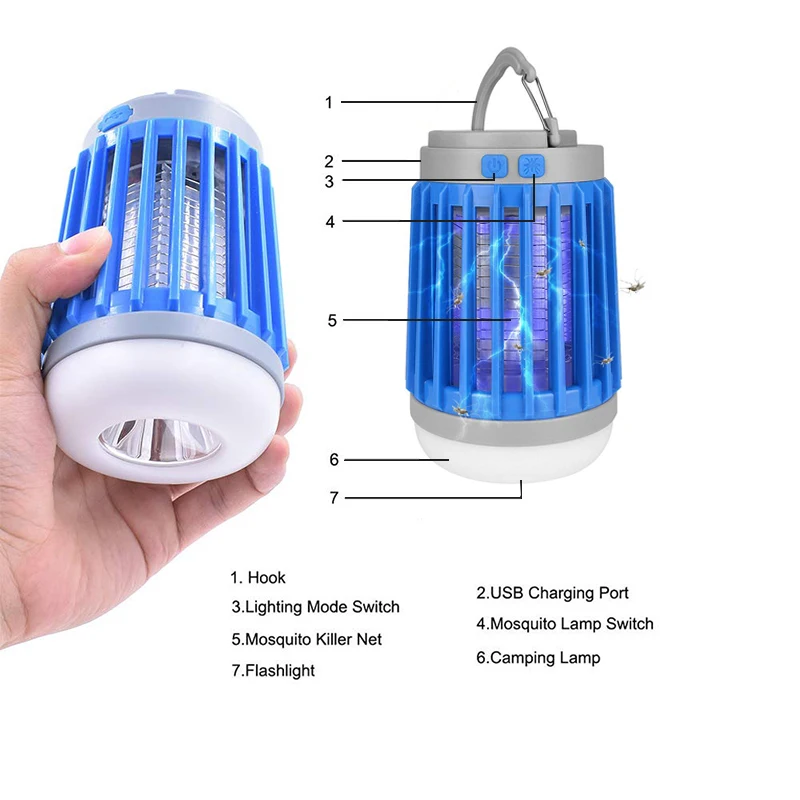 √ 3 в 1 Многофункциональный-наружный Жук лампа zapper-это комбинация кемпинговых фонарей, УФ-лампы для уничтожения комаров и аварийного освещения.√ Безопасный эффективный насекомый Zapper -- Специальный яркий фиолетовый ультрафиолетовый свет 360 нм-390 нм, физический метод привлечения и устранения насекомых. Безопасен для здоровья человека и окружающей среды.√ Водонепроницаемость IP67-не беспокойтесь о дождливых днях. Портативный идеально подходит для использования в помещении и на улице.√ Кемпинговый фонарь имеет портативный крючок-Откройте крючок, и его легко повесить. А при ловушке комаров эффект подвешивания будет лучше.√ 4 режима работы-Нажмите кнопку светильник ing», лампа изменится на 4 режима: Вспышка светильник свет SOS-высокая яркость-Низкая яркость