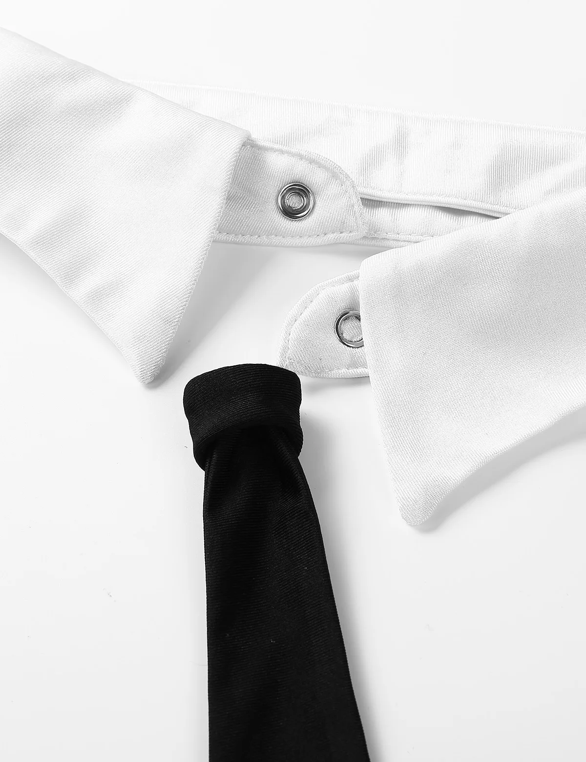 Сочетающийся воротник на пуговицах с милым галстуком и эластичный пояс на бретельках, создающий приятный мускулистый образ.