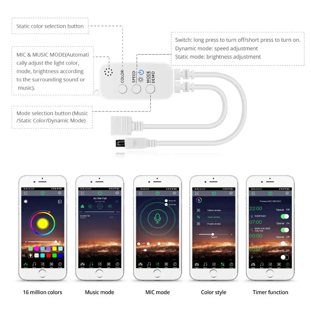 【APP Управление & микрофоном режима】 Управление верескового цвета, светодиодный светодиодные полосы света через приложение, дистанционный пульт Управление и Управление;. С помощью приложения вы можете свободно контролировать 16 миллионов цветов. Светильник с полоской bluetooth имеет умный музыкальный режим, встроенный микрофон с регулируемой чувствительностью, который создает романтику, релаксацию, вечерние атмосферу с музыкой, светильник s изменится с помощью музыки beats или микрофона.
