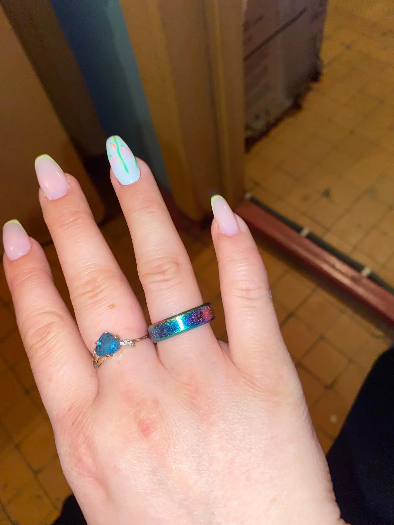 кольцо очень красивое, мне понравилось что его можно носить с одной стороны розово зелёное, а с другой стороны синее зелёное, размер 7 на российский 17, доставка быстрая.