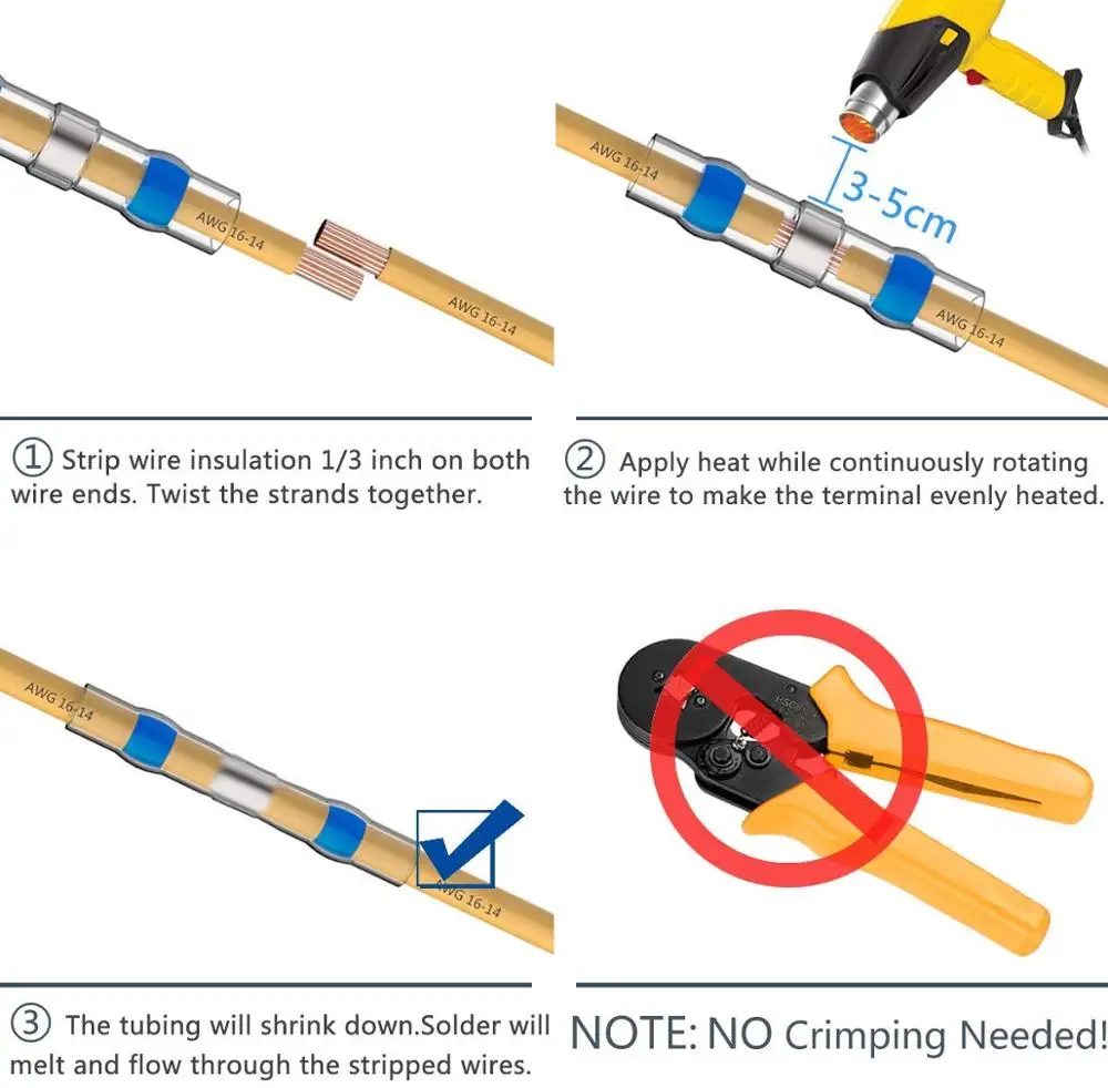 Диапазон рабочих температур: ● Минимальная температура припоя для расплава: 138 °C ● Минимальная температура сжатия: 80 °C ● Рабочая температура:-55 ℃ - 125 ℃ ● Температура сжатия: >160 ℃ Спецификация: ★Цвет: желтый, синий, красный, белый. ★Размер: 300 шт.: 50 х белых разъемов для припоя: диаметр 1,7 мм, сечение кабеля 0,25-0,34 мм² (A.W.G.:26-24). 100 x соединителей синего припоя: диаметр 4,5 мм, сечение кабеля 1,5-2,5 мм² (A.W.G.:16-14); 130 x красные соединители для пайки: диаметр 2,7 мм, сечение кабеля 0,5-1,0 мм² (A.W.G.:22-18); 20 желтых разъемов для пайки: диаметр 6,0 мм, сечение кабеля 4,0-6,0 мм² (A.W.G.:12-10) Особенности: ★Коэффициент усадки составляет 2:1 ★Двухстенные трубки: полиолефиновые трубки снаружи и термоплавкий клей внутри ★Цветная Соединительная трубка ★Термоактивированный водонепроницаемый клей ★Низкотемпературный паяльный рукав ★Припой и термоплавкий клей внутри могут быть идеально водонепроницаемыми. ★Водонепроницаемые Паяные соединители предотвращают коррозию проводов. ★Соответствует стандартам ROHS, ISO 9001:2008, SGS и CE. Гарантия: Guarantee 100% гарантия удовлетворенности за покупки без риска! 24 24 часа после продажи команда обслуживания для консультации и решения проблем.
