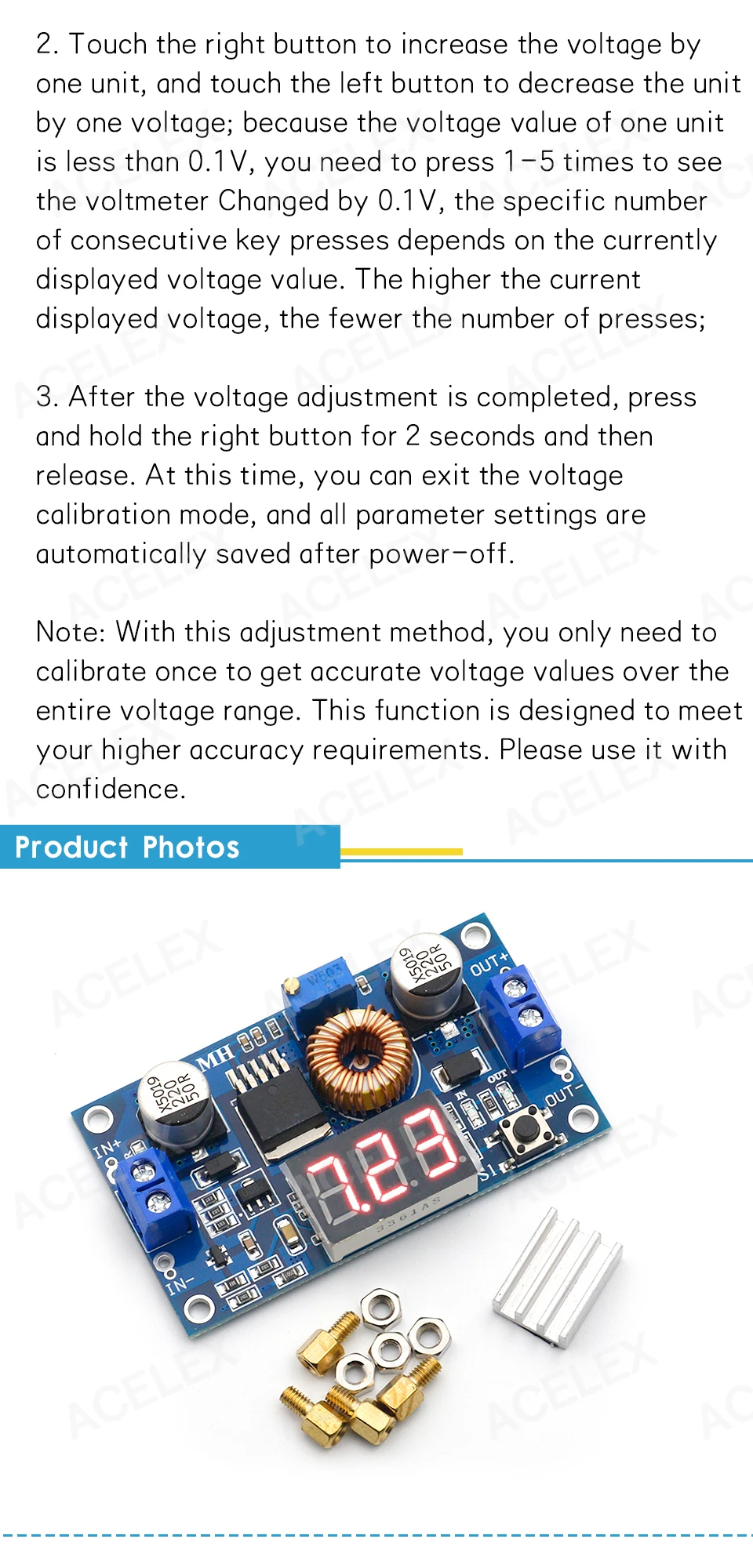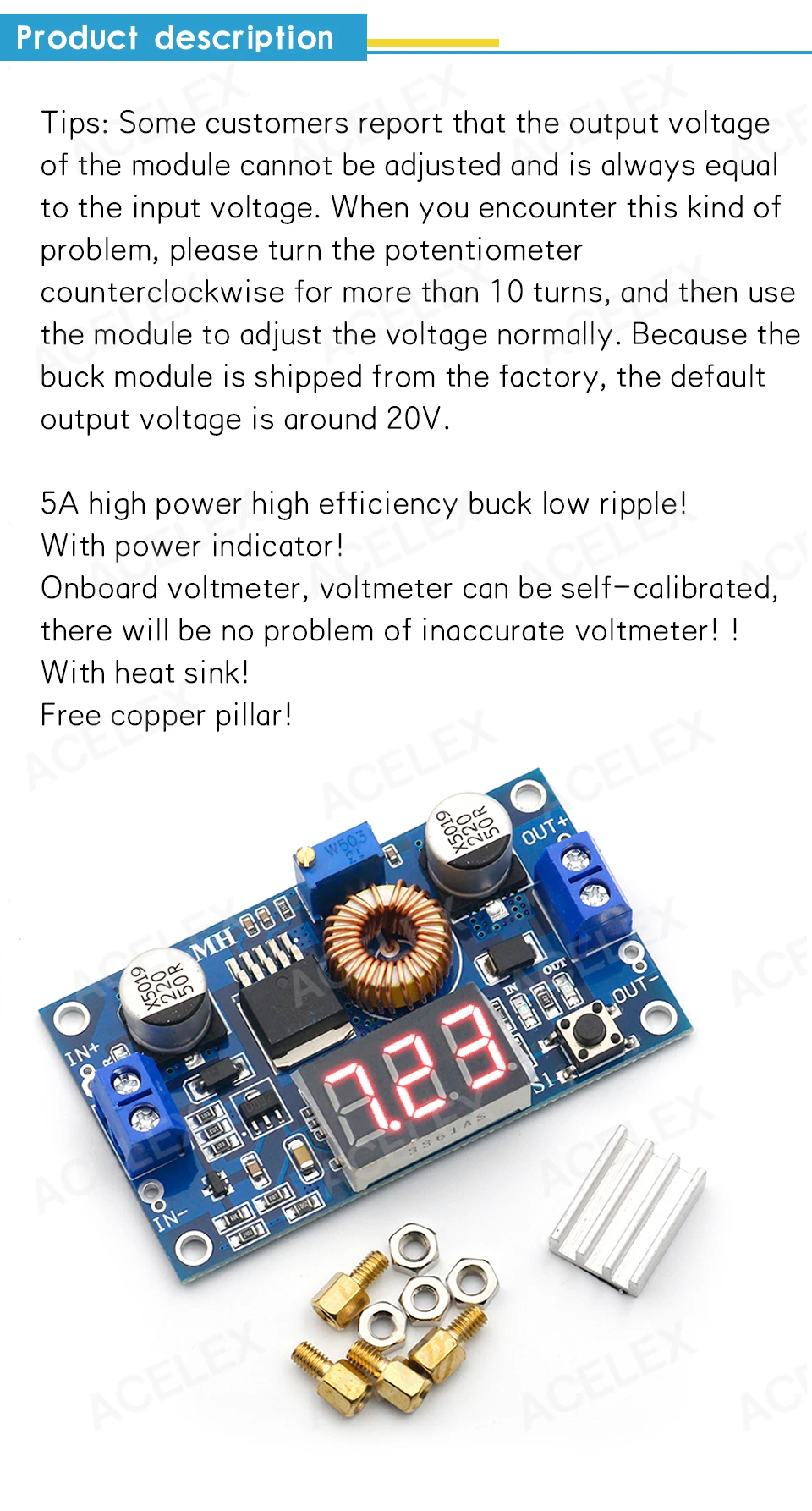 Трек не отслуживался вообще. Модуль рабочий. Напряжение без нагрузки держит хорошо. Выставил 5V, подключал к блокам 12V и 20V, держит выставленное напряжение. Различие выходного напряжения с мультиметром 0,1-0,2V. Проверю под нагрузкой, если будут проблемы, дополню.
