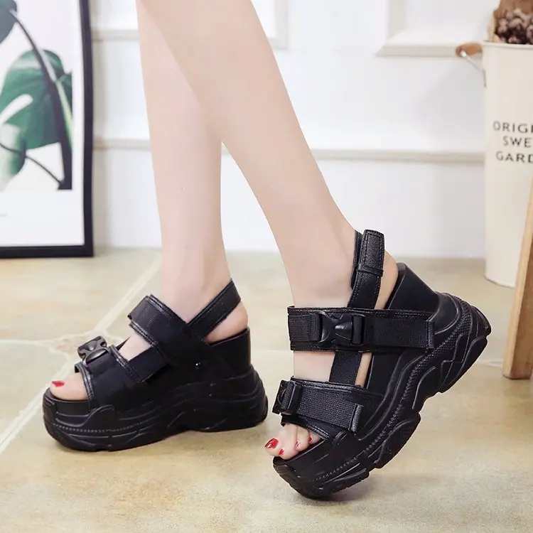 Сандалии женские на платформе, пляжные босоножки на танкетке, с пряжкой, толстая подошва, спортивные, черные