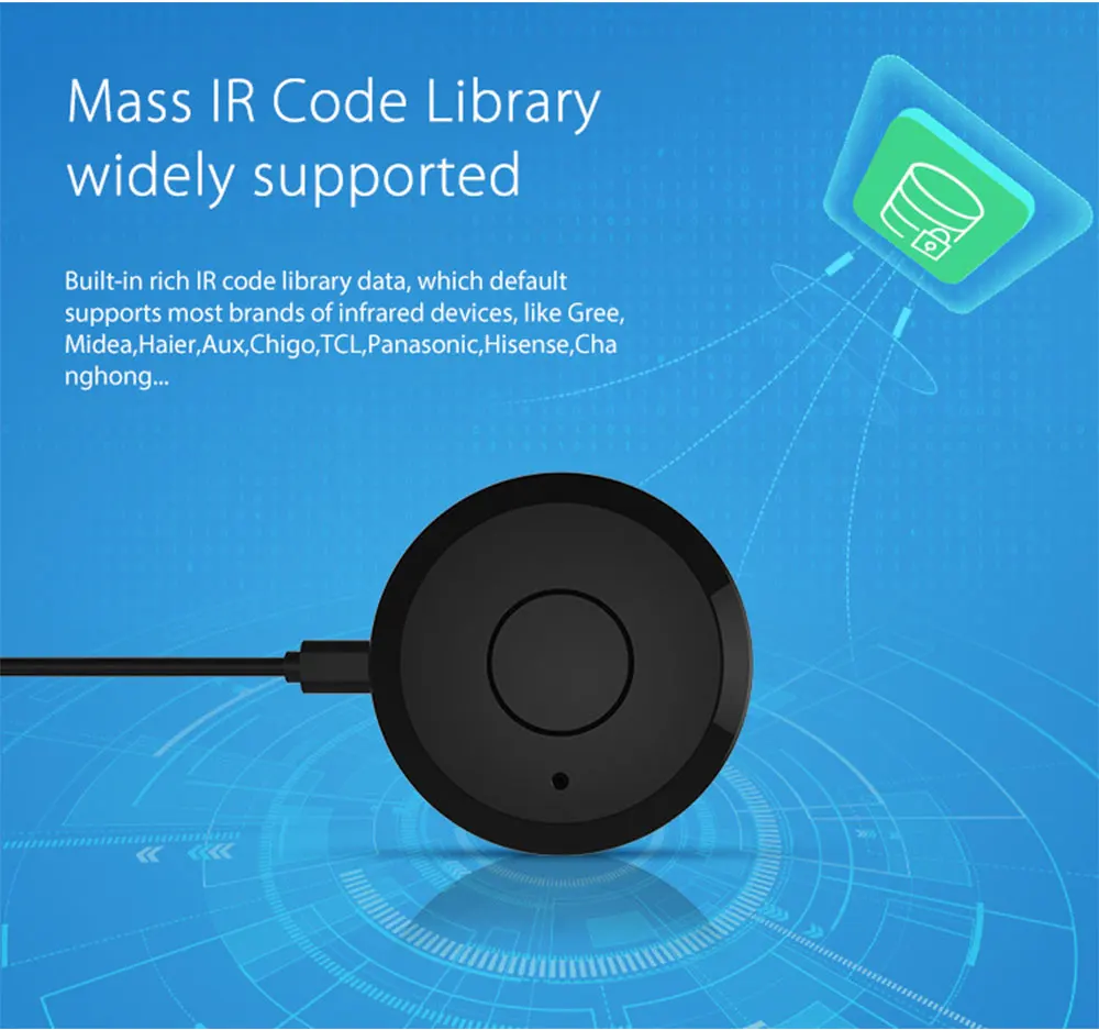 -- Название продукта: Tuya WiFi-IR универсальный пульт дистанционного управления-Вход питания: DC5V/1A-- Частота ИК: 38-56 кГц-- Диапазон покрытия: 360 °-Максимальный ток: 110 мА-Максимальная мощность: 0,55 Вт-Беспроводной стандарт: WIFI 2,4G 802,11 b/g/n-Режим управления: мобильное приложение «Tuya/SmartLife»-Поддержка приложения: Android/iOS-- Материал: Поликарбонат/АБС-пластик-Размер изделия: 68*68*22 мм (Д * Ш * В)-Товар Вес: 33 г/1,2 oz