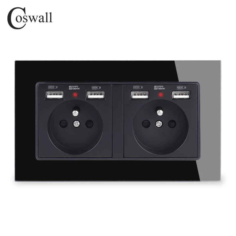 Настенная розетка COSWALL, 2 клавиши, французская стандартная с 4 USB-портами для зарядки, скрытый мягкий светодиодный индикатор, прозрачная стеклянная панель, черный белый серый