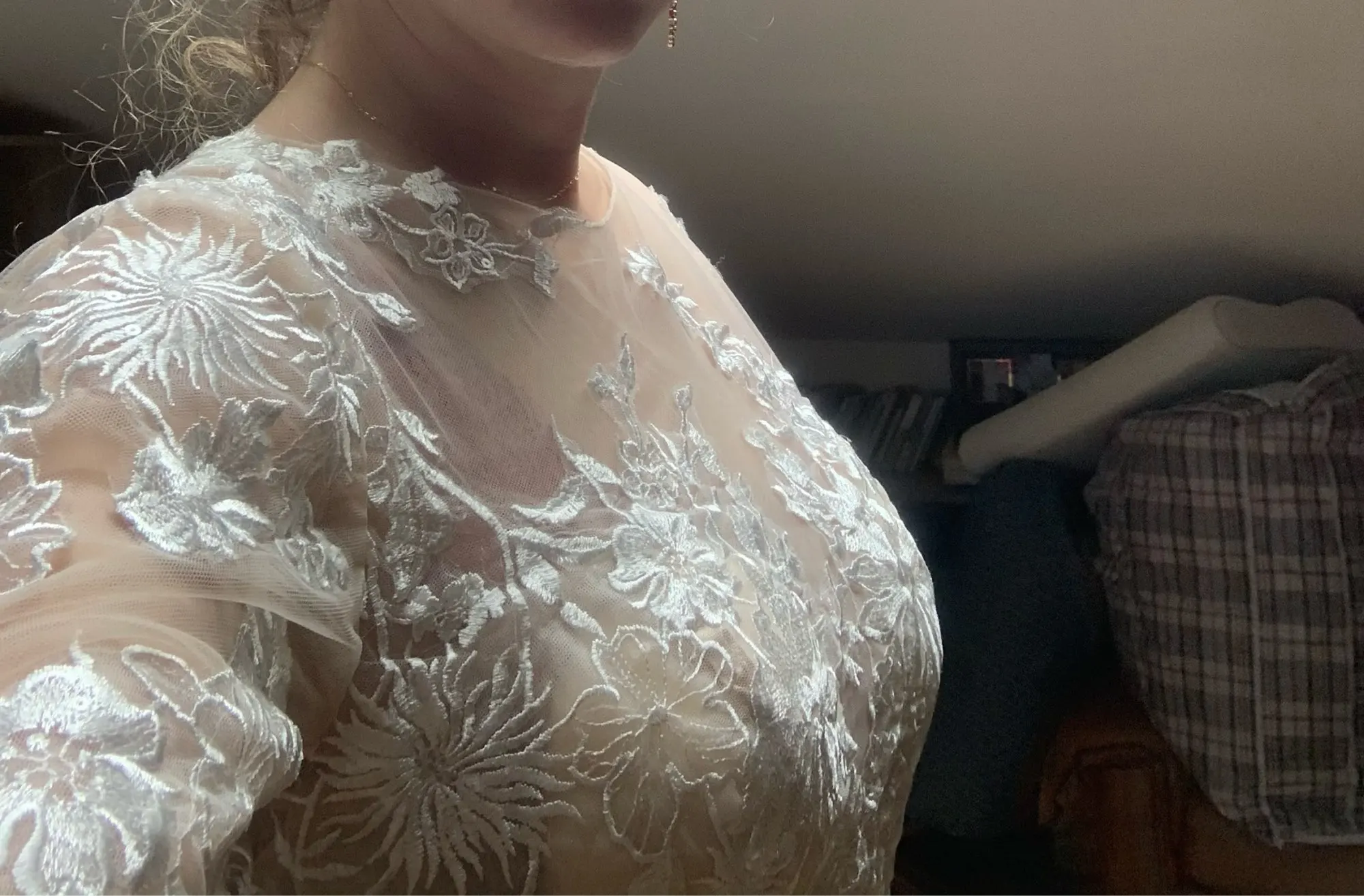 Это платье потрясающее. Безусловно, размер больше. Я рад, что сделал это. Детали Потрясающие, а качество материала фантастическое. Я так рад носить это платье. Это всего лишь мечта.